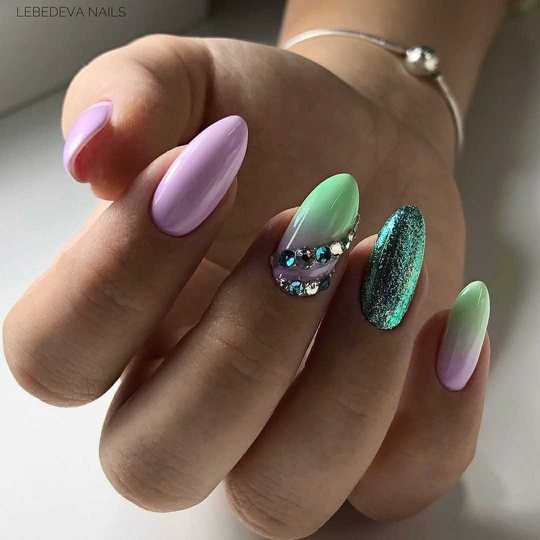 Выигрышным вариантом для длинных ногтей станет градиент – сиреневый цвет, переходящий в более светлый, молочный оттенок. Маникюр дополнительно украшают фольгой, стразами и блестками. Особенно популярно нанесение цветочных принтов, полосок и создание эффекта дымки.