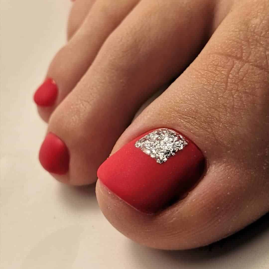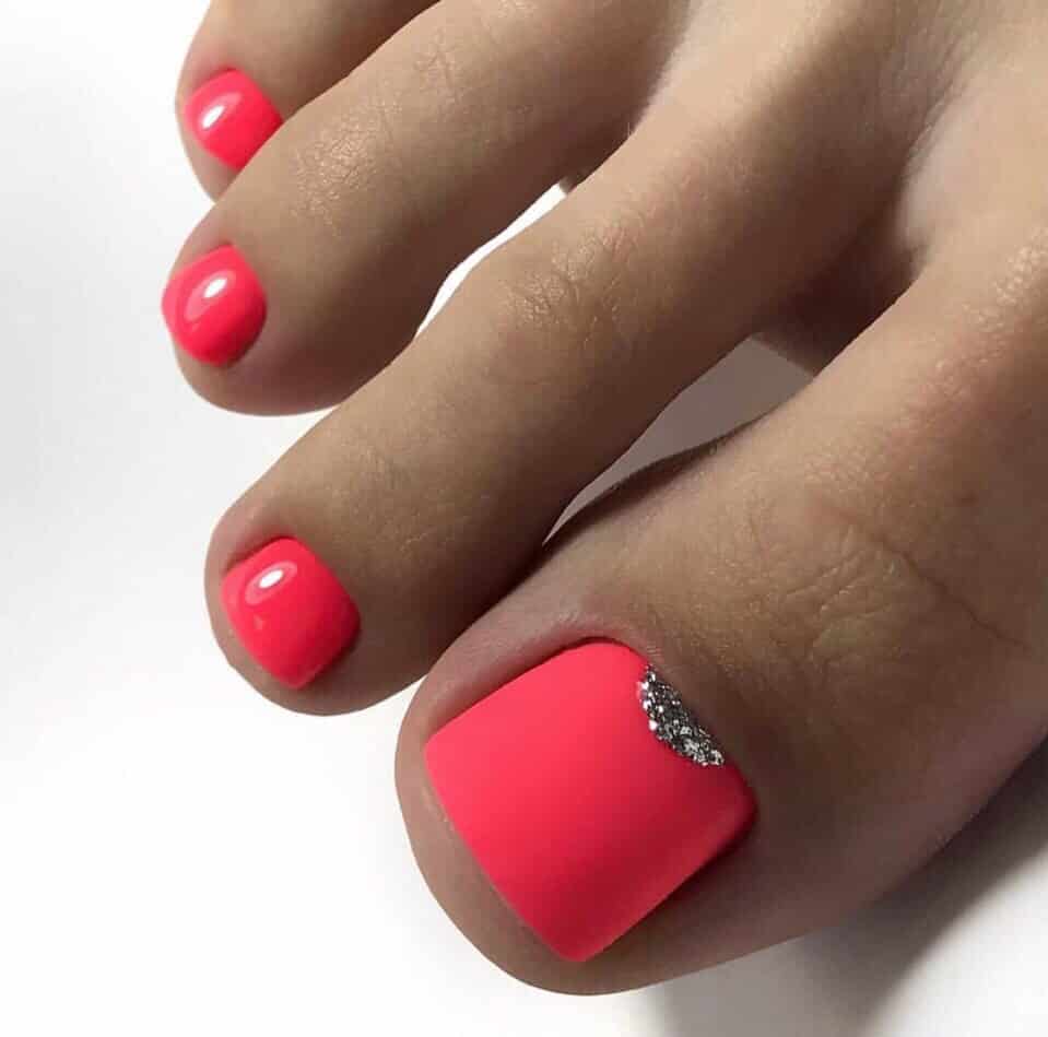 В первом варианте важно разместить украшения или рисунки на большом акцентном ногте. Также очень интересно смотрится в таком педикюре одновременное сочетание матового и глянцевого покрытия