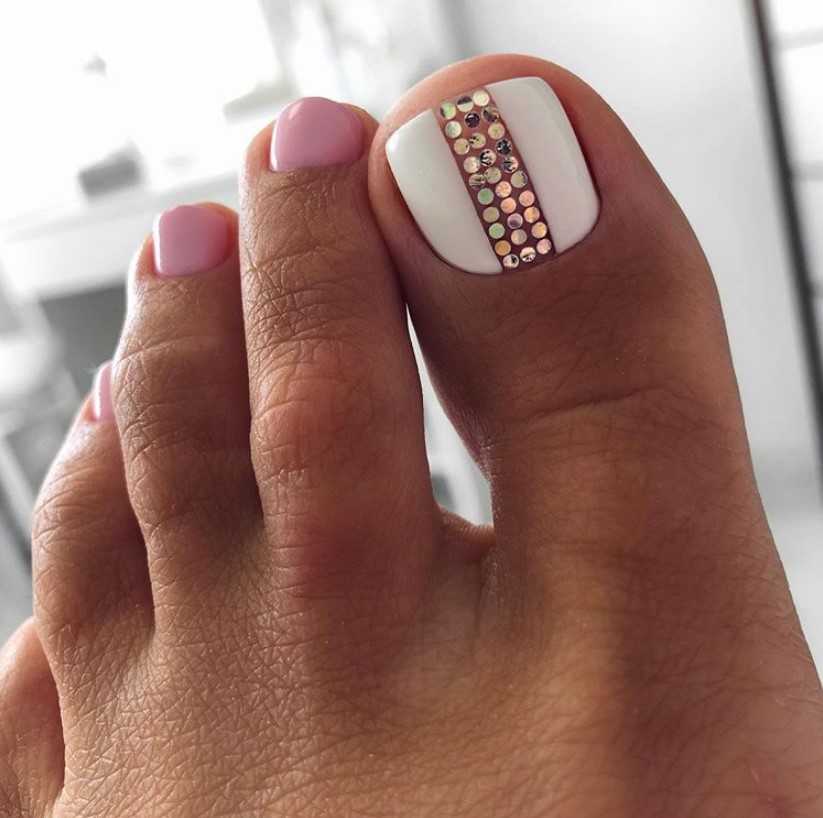 На белоснежную основу можно нанести полоски, а чтобы смотрелось ярче, можно дополнить цветочные слайдеры. Кроме того, к сочетанию черно-белых красок подойдет дополнение из других тонов, таких как ярко-розовый или желтый. Вы получите прекрасное сочетание, объединив в единую композицию белый цвет и розовый, такой педикюр подойдет девушке с романтичным характером, подчеркнув ее нежную натуру. Бело-розовое покрытие ногтей хорошо подходит к принту с цветочным рисунком и прекрасно впишется в весенний и летний стиль. С таким педикюром следует выдержать обязательное условие – розовый цвет должен присутствовать только в одном из предметов одежды или аксессуара.