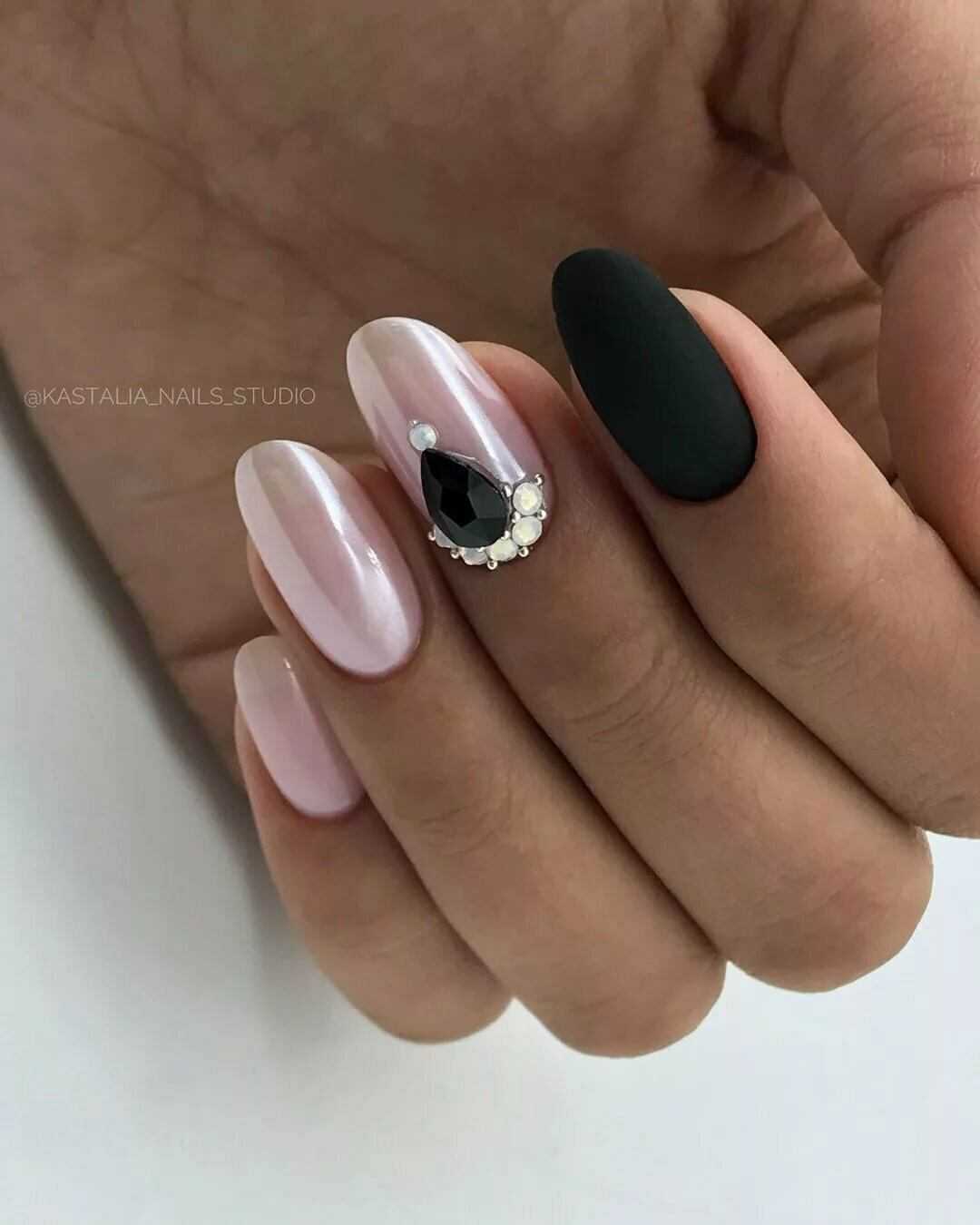 Один из самых топовых видов дизайна – это матовые покрытия с добавлением блестящих частиц. Также маникюр можно дополнить камифубуки, стразами или кусочками фольги.
