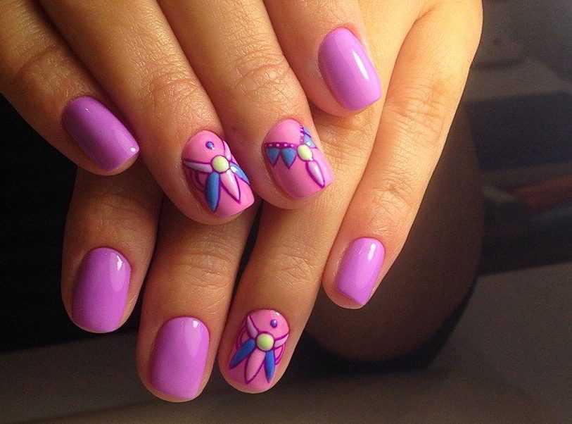 Розовый маникюр с рисунком может быть разным. Мастера рисуют геометрические или флористические узоры, ставят точки или делают полоски. По желанию можно нанести более сложные и реалистичные дизайны в виде животных, мультипликационных персонажей и т.д.