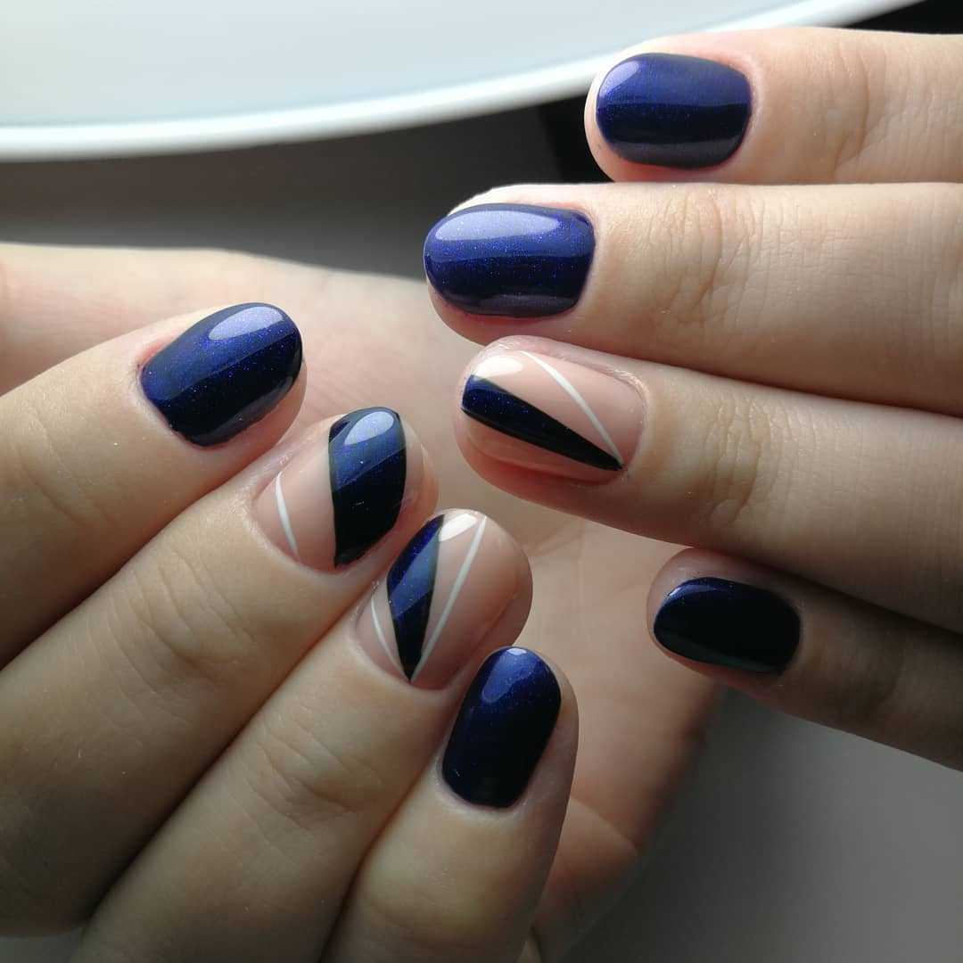 Еще один актуальный цвет для коротких ногтей – темно-синий. Очень часто маникюр в этом цвете выбирают девушки, которым по дресс-коду нельзя выбирать яркие цвета. Нейл-арт в этом тоне хорошо смотрится как в однотонном дизайне, так и в красивой технике «кошачий глаз». Также можно использовать броский декор
