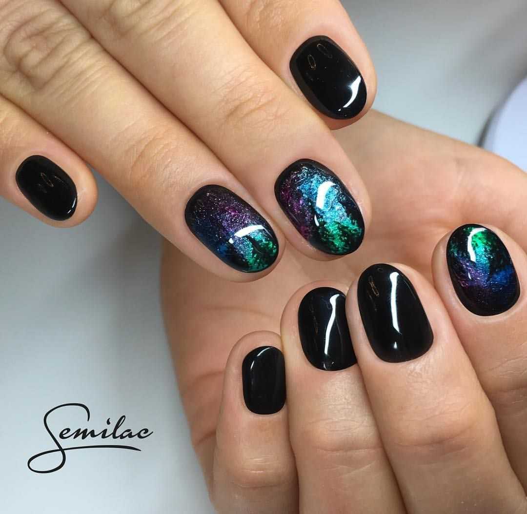 Градиент и омбре — возможность показать на одном ноготке палитру темного цвета. Начните с черного или самого мрачного из выбранных оттенков и плавно переходите к более светлому.