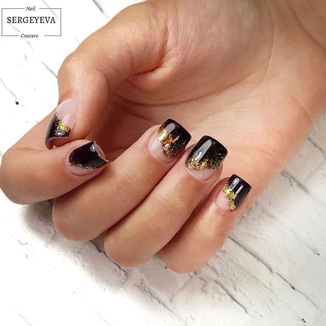 Идеальный выбор для коротких ноготков – френч. Маникюр в черных тонах предполагает контрастную линию свободного края, это может быть серебро, переход к прозрачному или нюдовому краю. Если есть акцентные ногти, то лучше всего украсить их интересными элементами: рисунком, полоской или точкой.