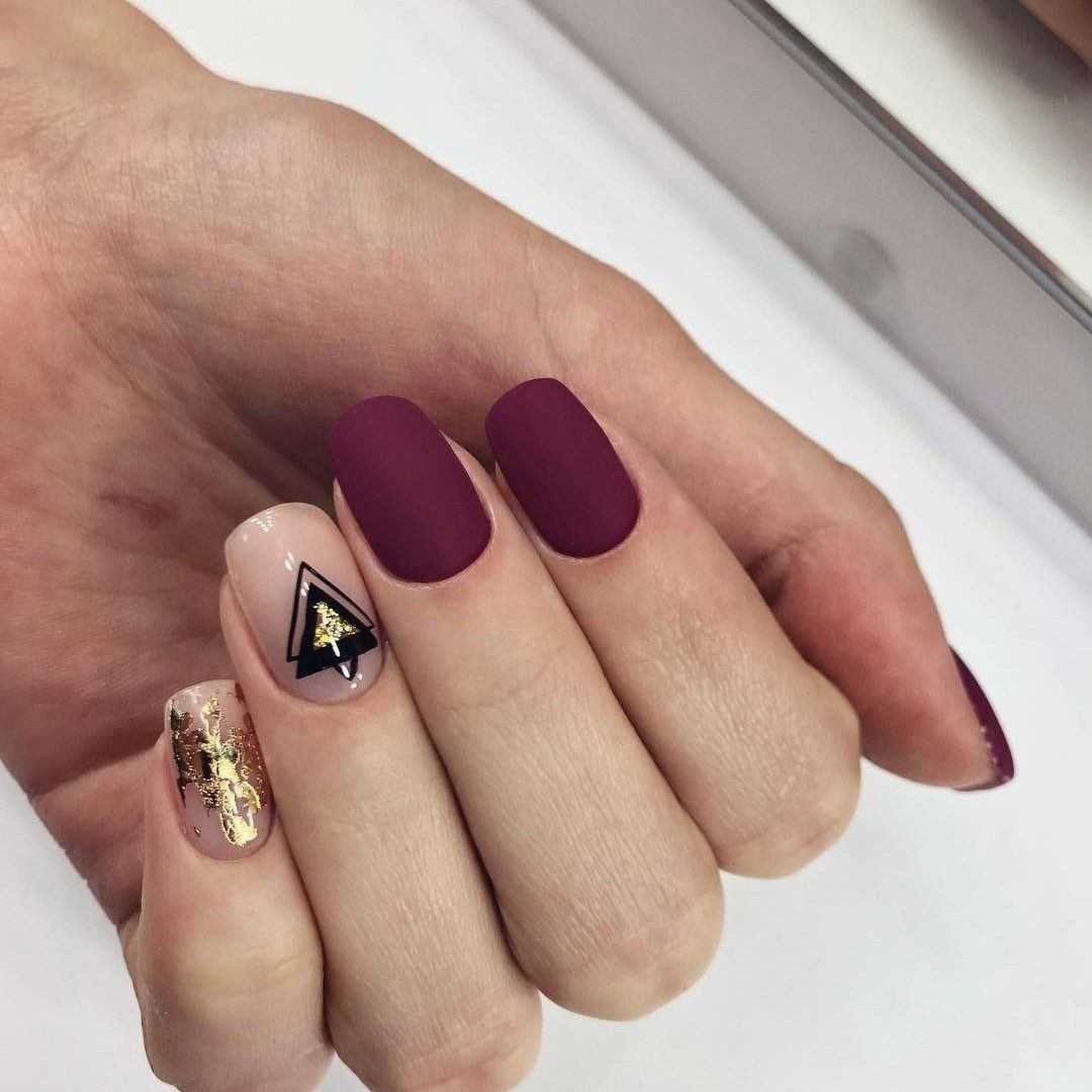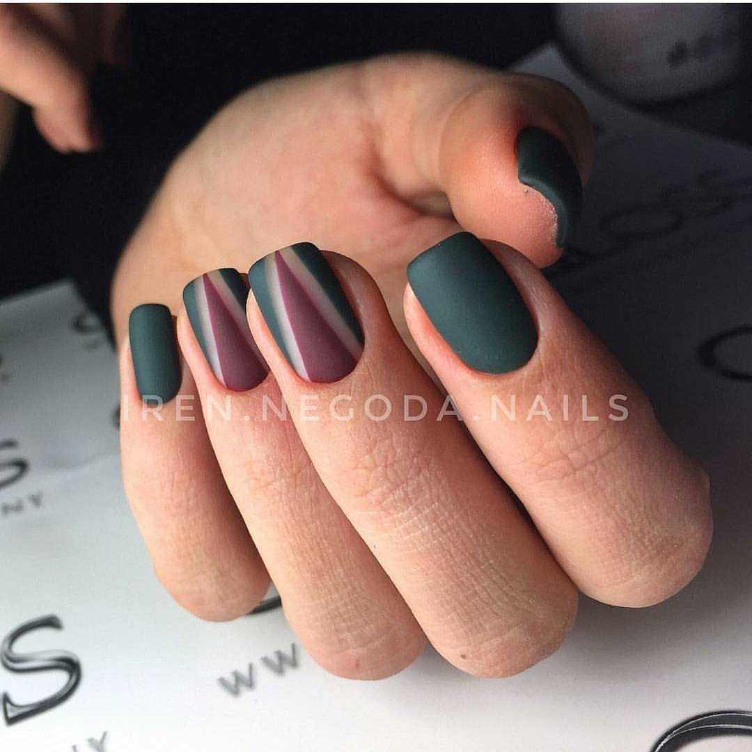 Темные цвета лака и матовый топ — убойное сочетание для модного маникюра. Вы сможете воплотить множество идей. Самое простое — сочетание матового и глянцевого оформления на одной руке.