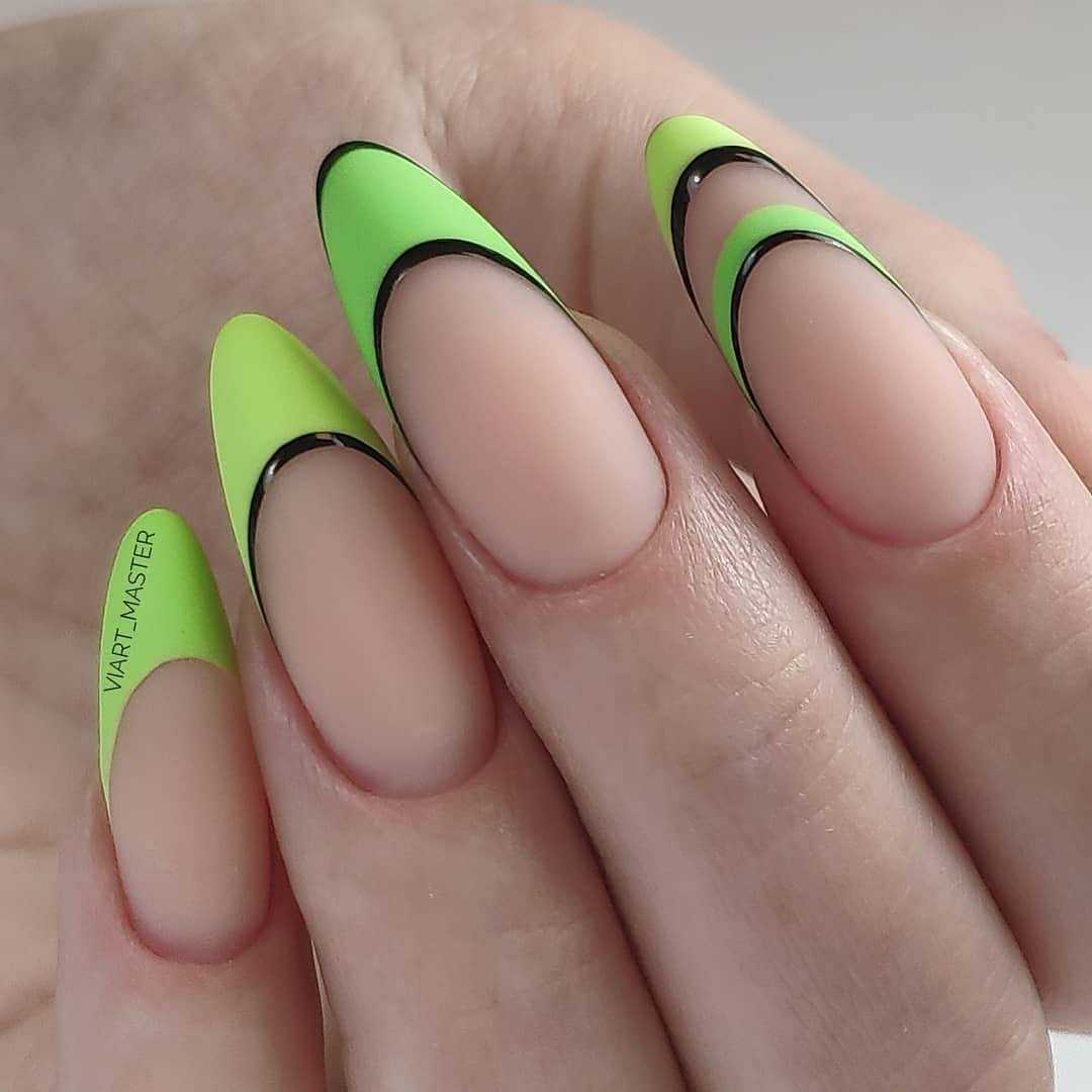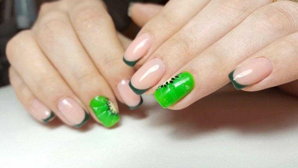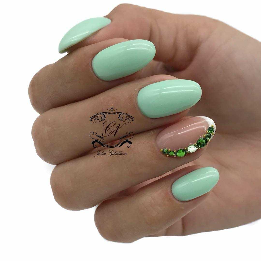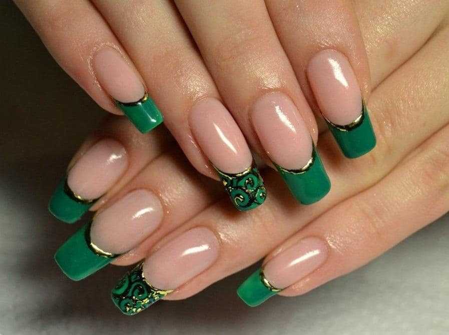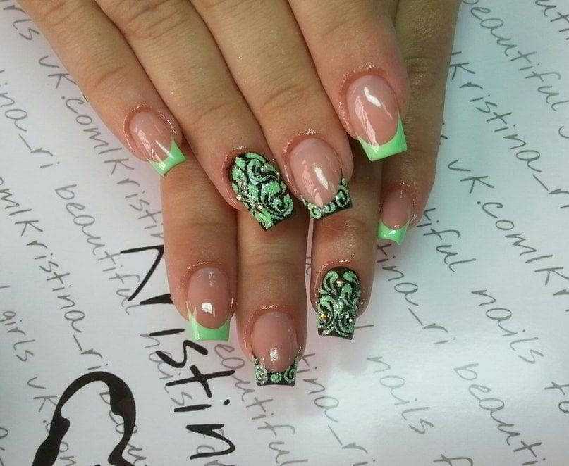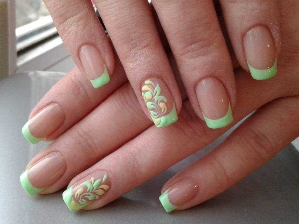 Зеленый френч принесет в весь образ свежести и спокойствия. В палитре мастера будет доступны изумрудные, салатовый, бутылочные, морские и другие цвета, которые точно смогут поднять вам настроение. Зеленый нежный и спокойный цвет, поэтому подобный френч не будет сильно выделятся. Лучшим сезоном года на подобный цвет считается весна.