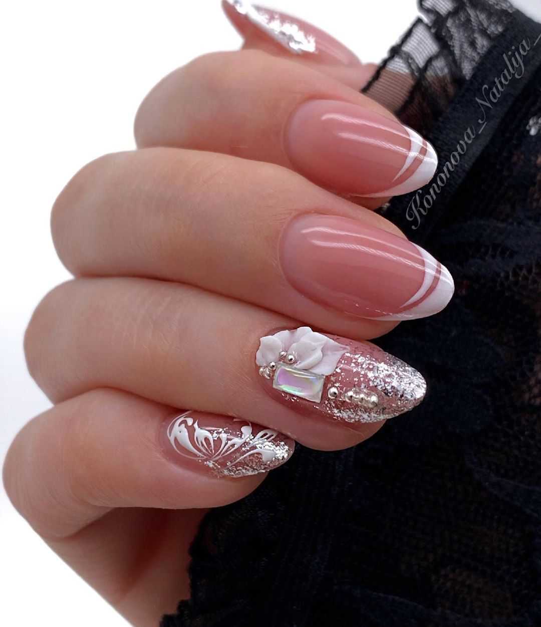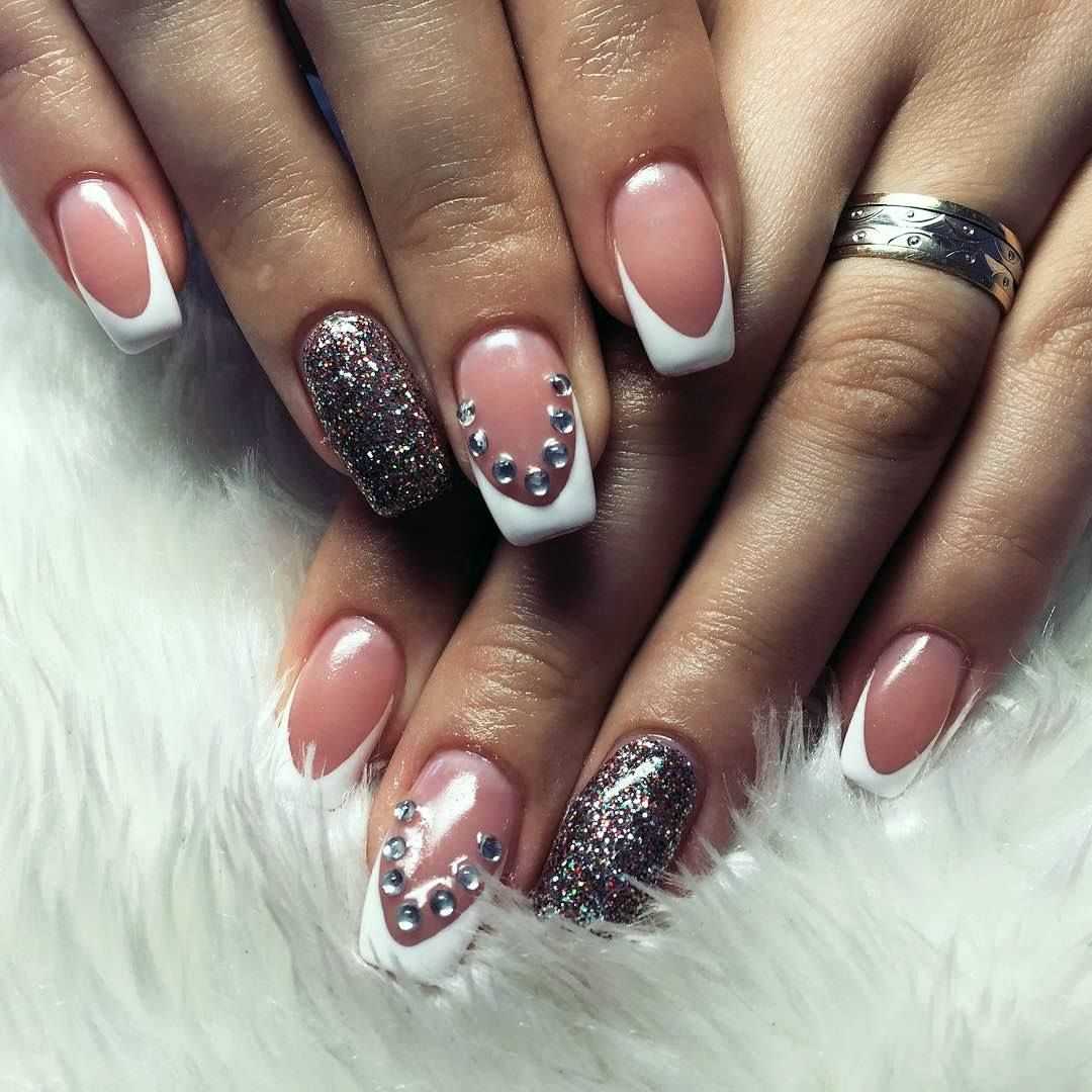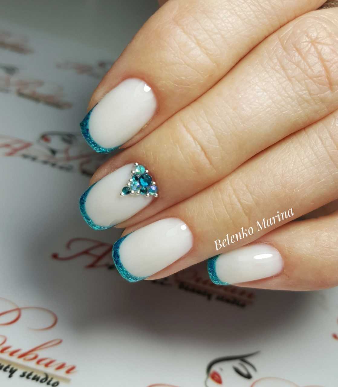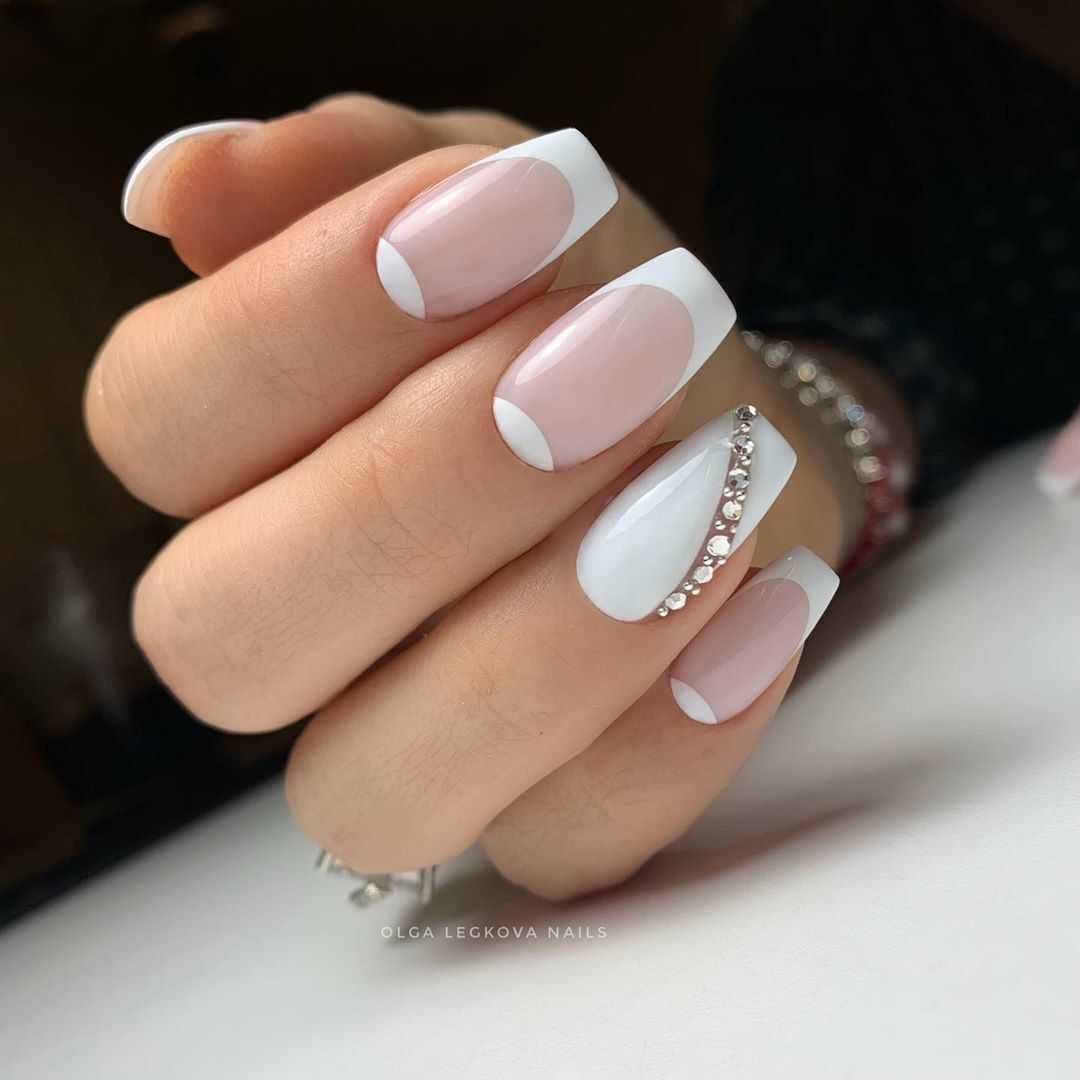 Самый нежный и спокойный вариант френча. Подходит как на каждый день, так и на праздник или офисное мероприятие. Лучше всего белые ногти смотрятся с геометрическими фигурами, небольшими узорами, цветами, с кружевом, стразами или глиттером.