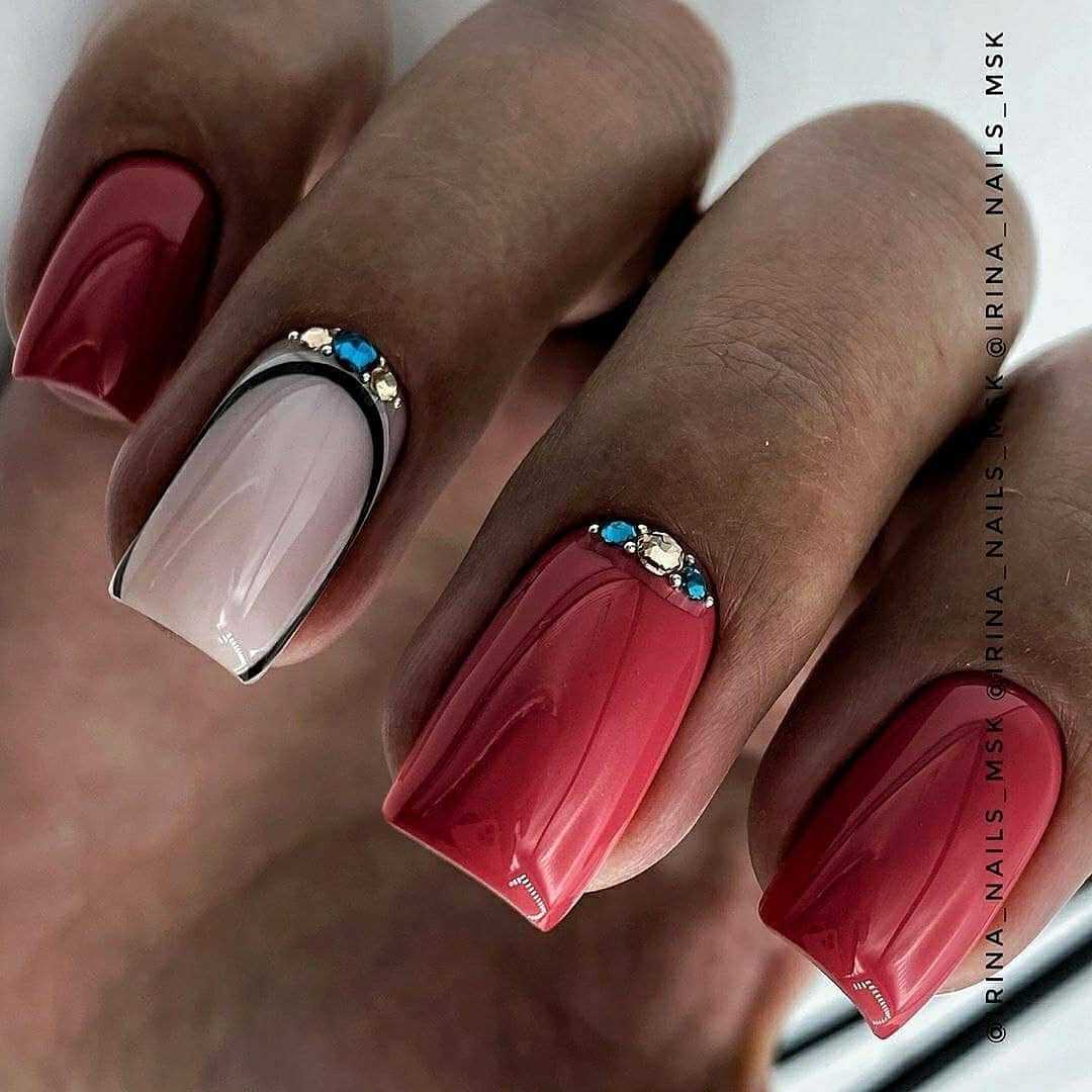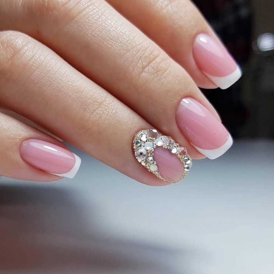 Дополнительно можно украсить отдельный пальчик стразом, рисунком или в технике «битое стекло». Это придаст разнообразие классическому маникюру.
