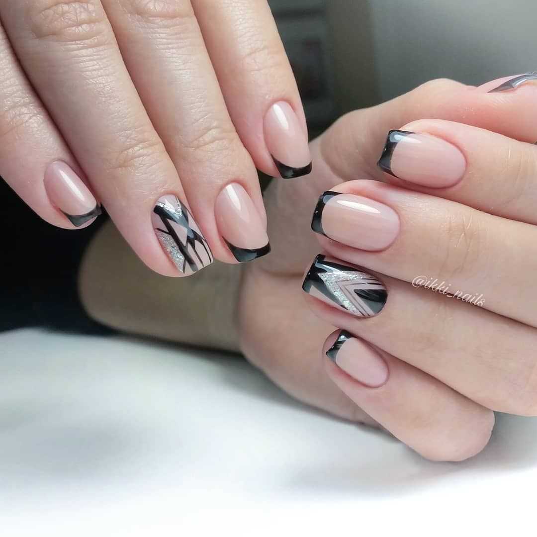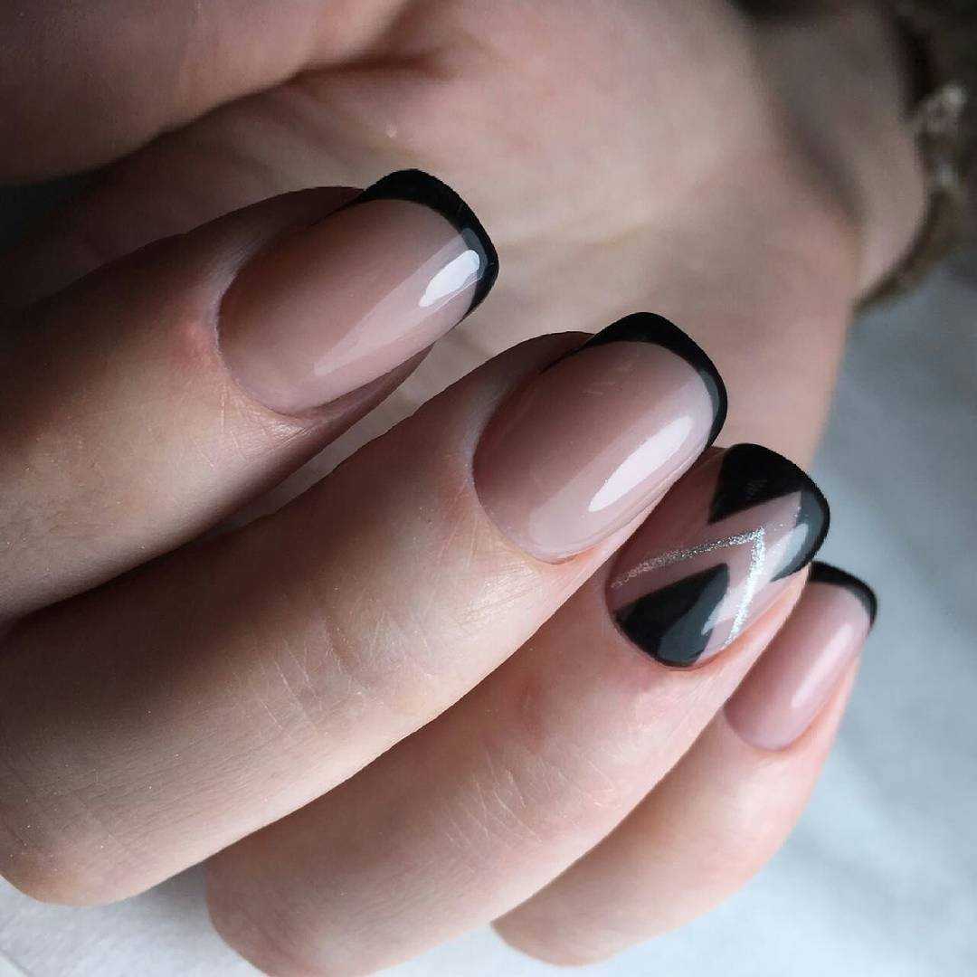 Черный френч всегда оригинальный и невероятно стильный. Он безусловно относится к яркому виду маникюра, хотя сам по себе темный