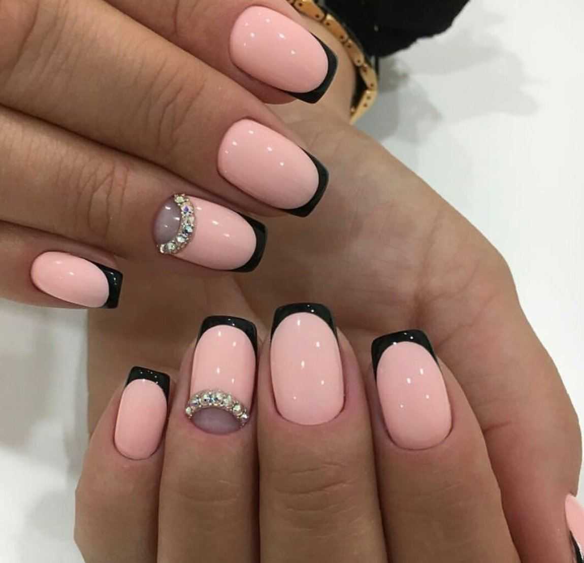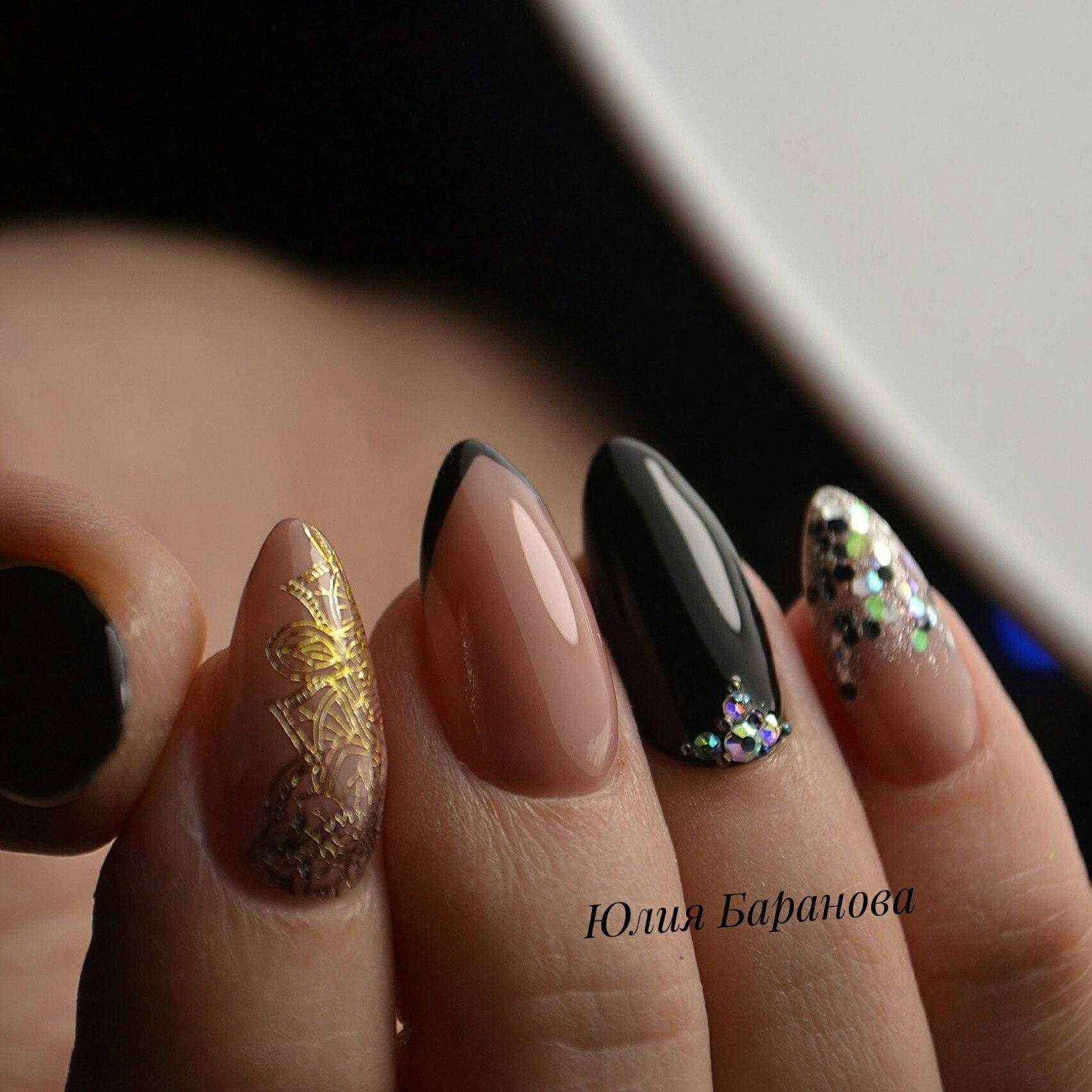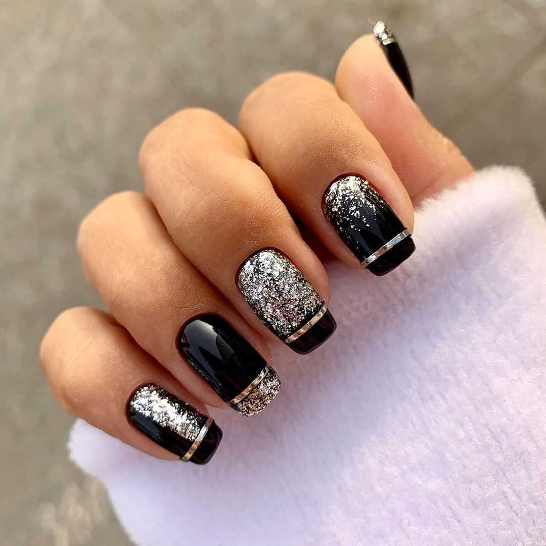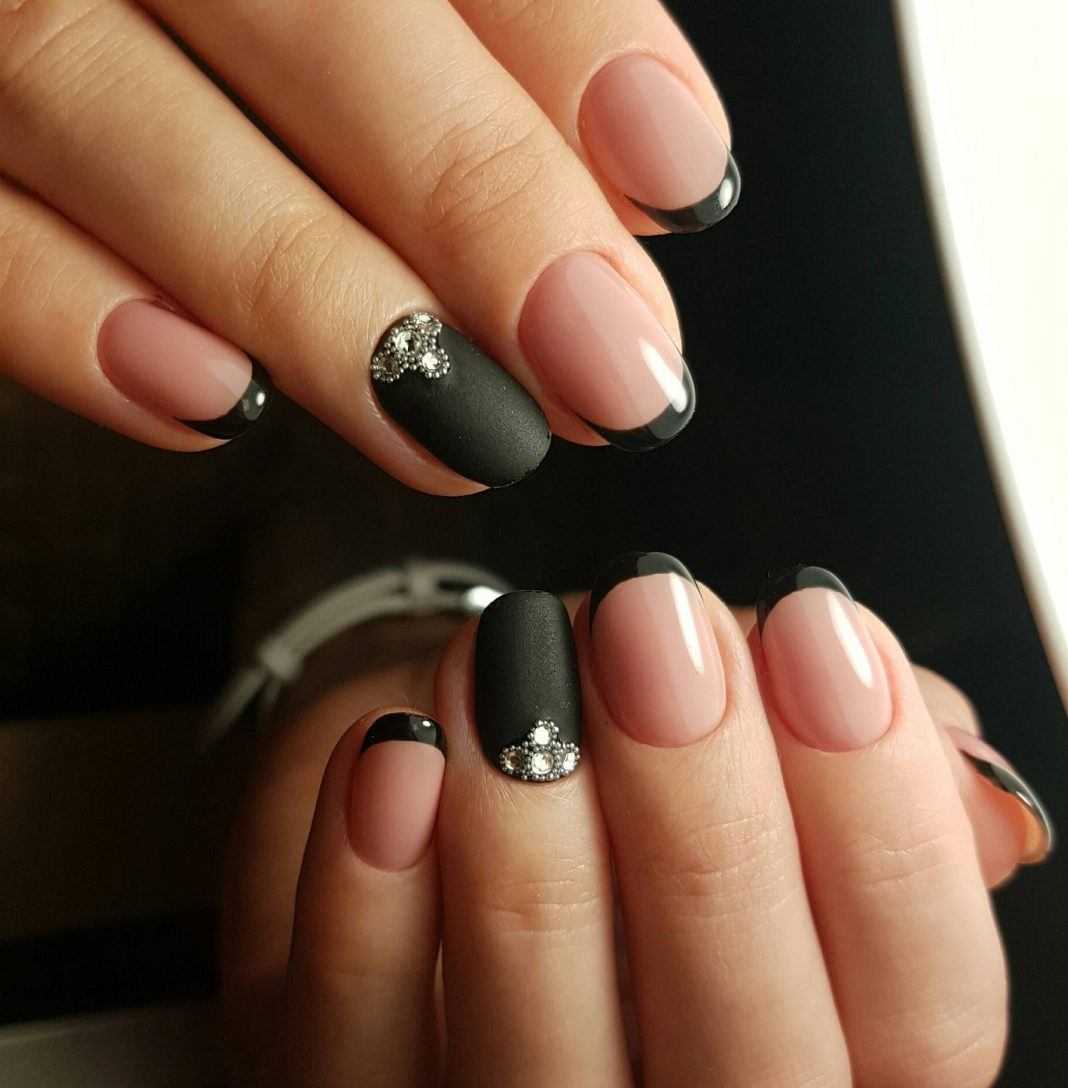 Строгий черный маникюр подходит для различных мероприятий — официальных и торжественных. Кончик ногтя допустимо оформить в контрастном светлом цвете. Эффектно смотрится вместе золотыми или серебряными оттенками, со стразами или глиттером.