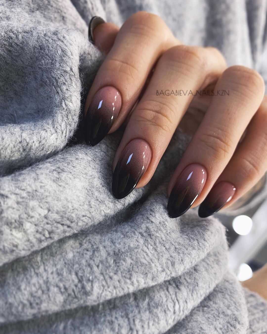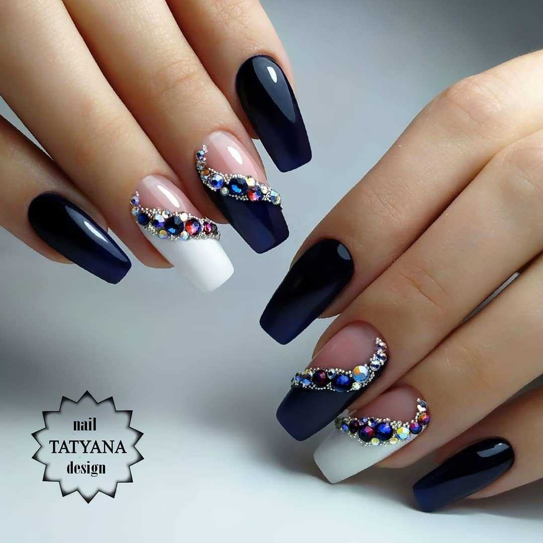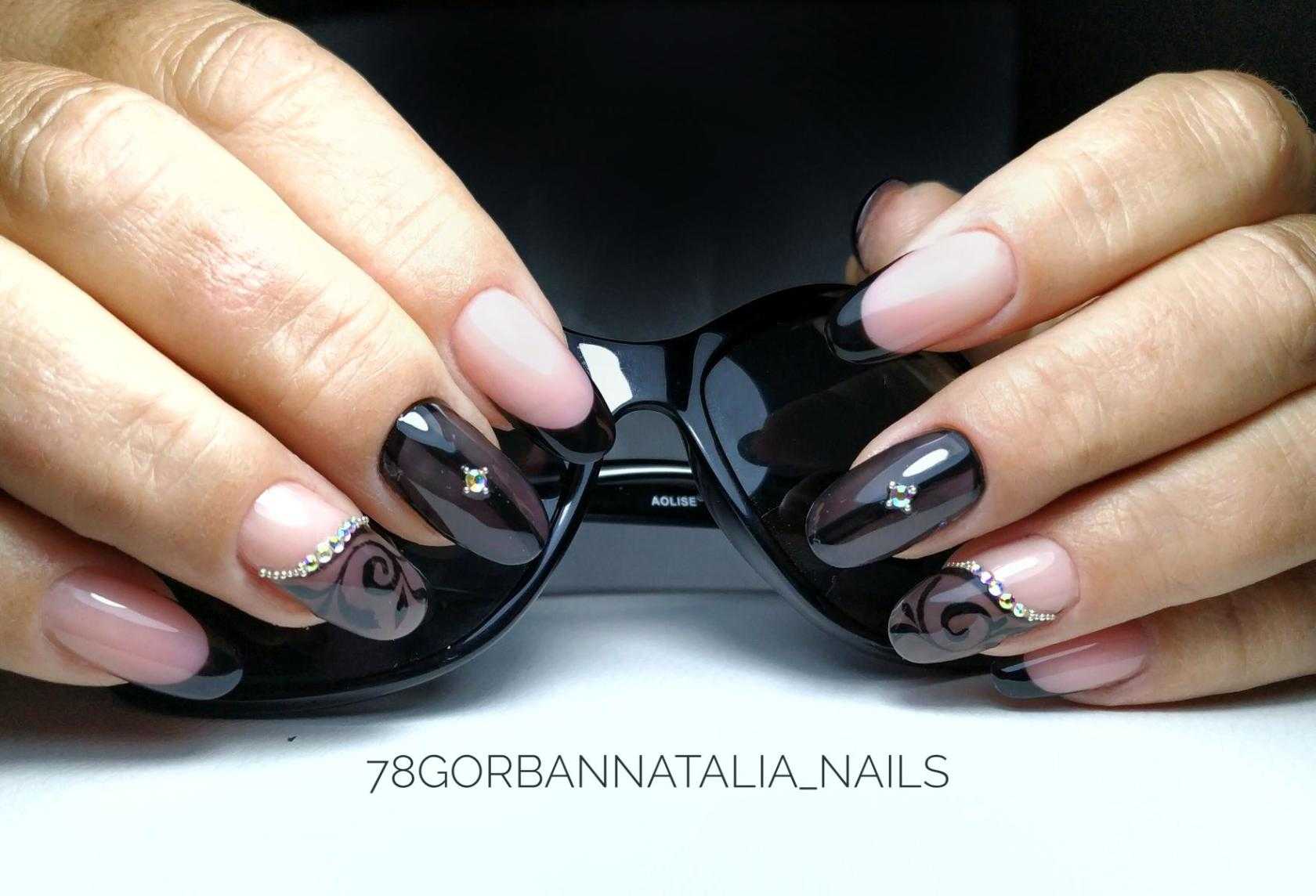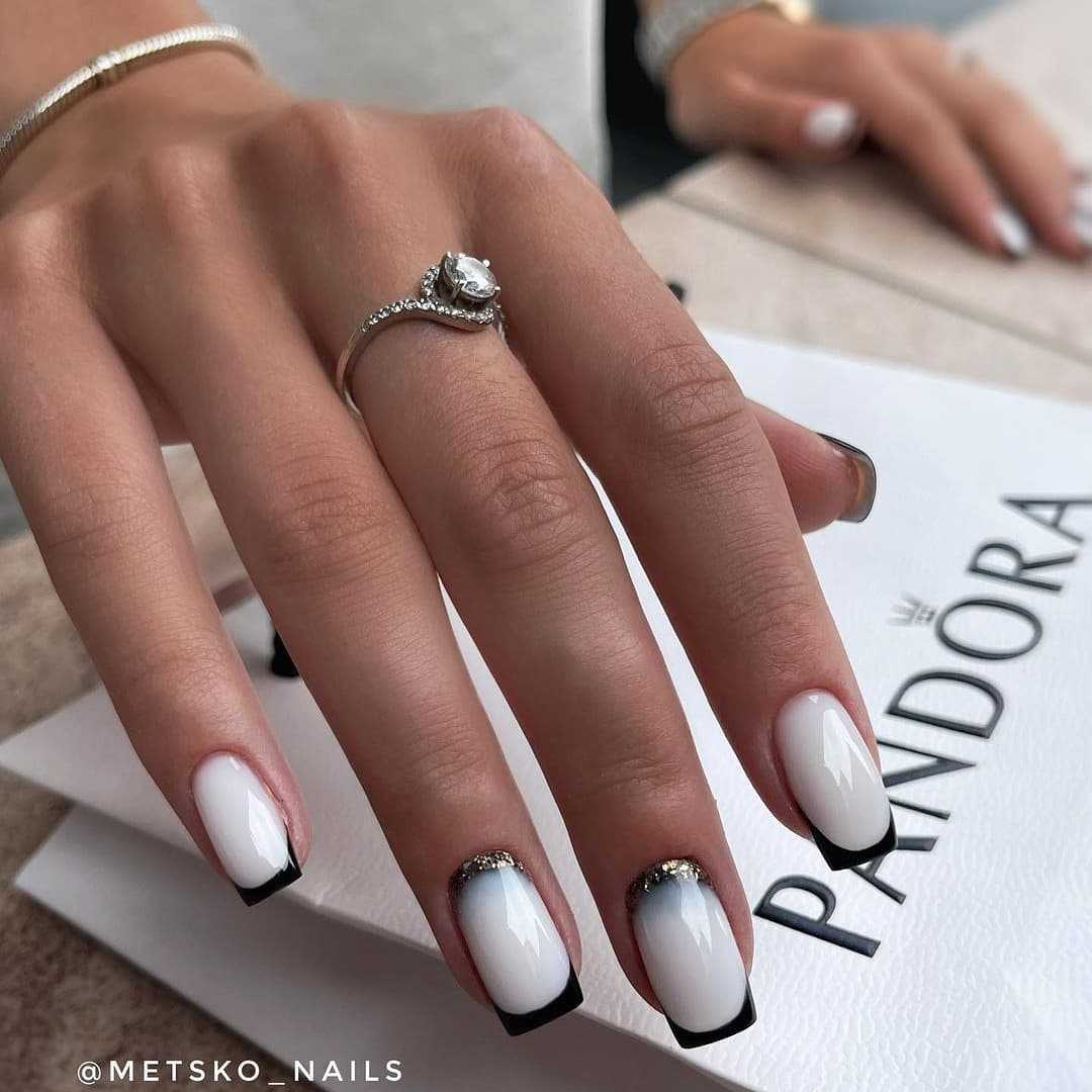 Строгий черный маникюр подходит для различных мероприятий — официальных и торжественных. Кончик ногтя допустимо оформить в контрастном светлом цвете. Эффектно смотрится вместе золотыми или серебряными оттенками, со стразами или глиттером.