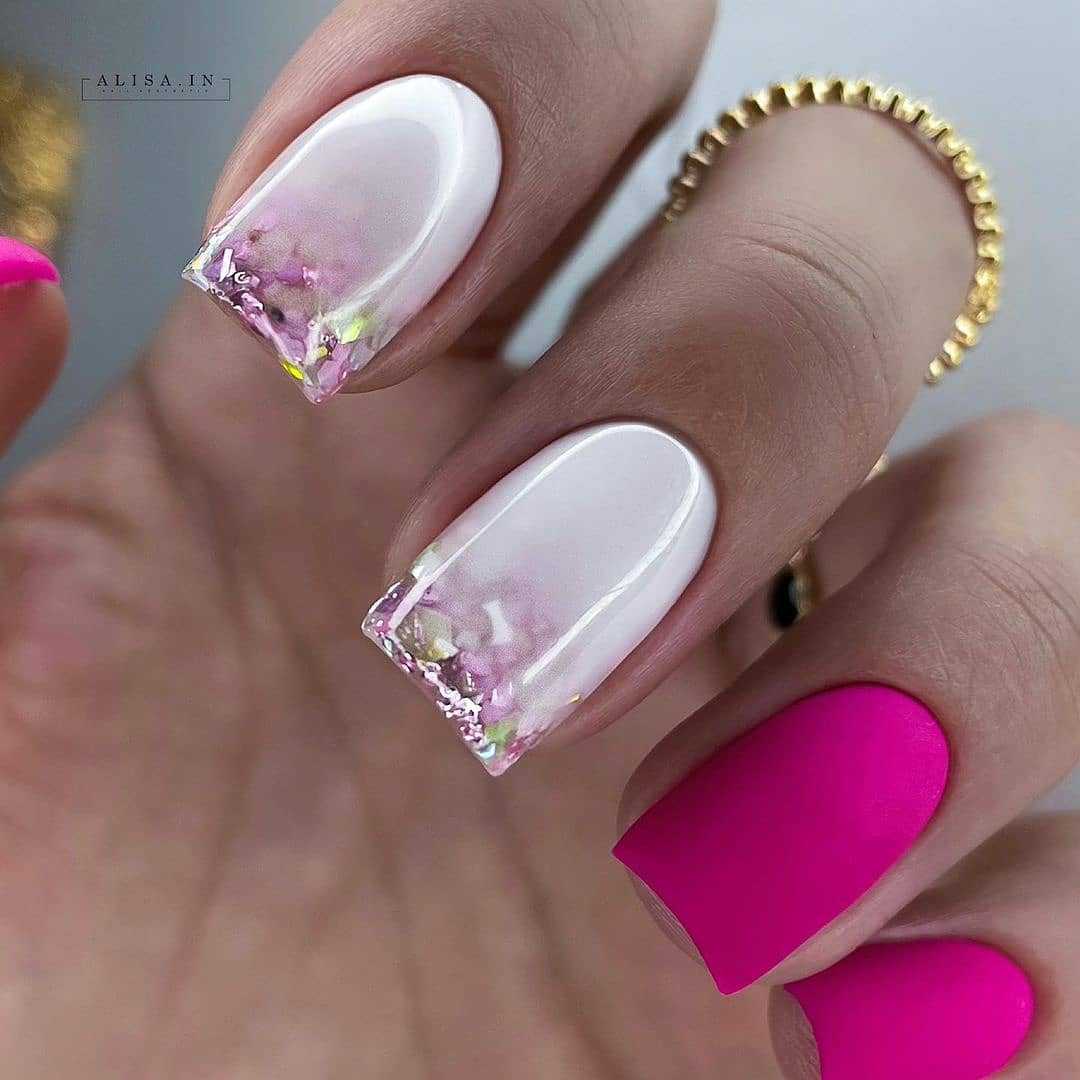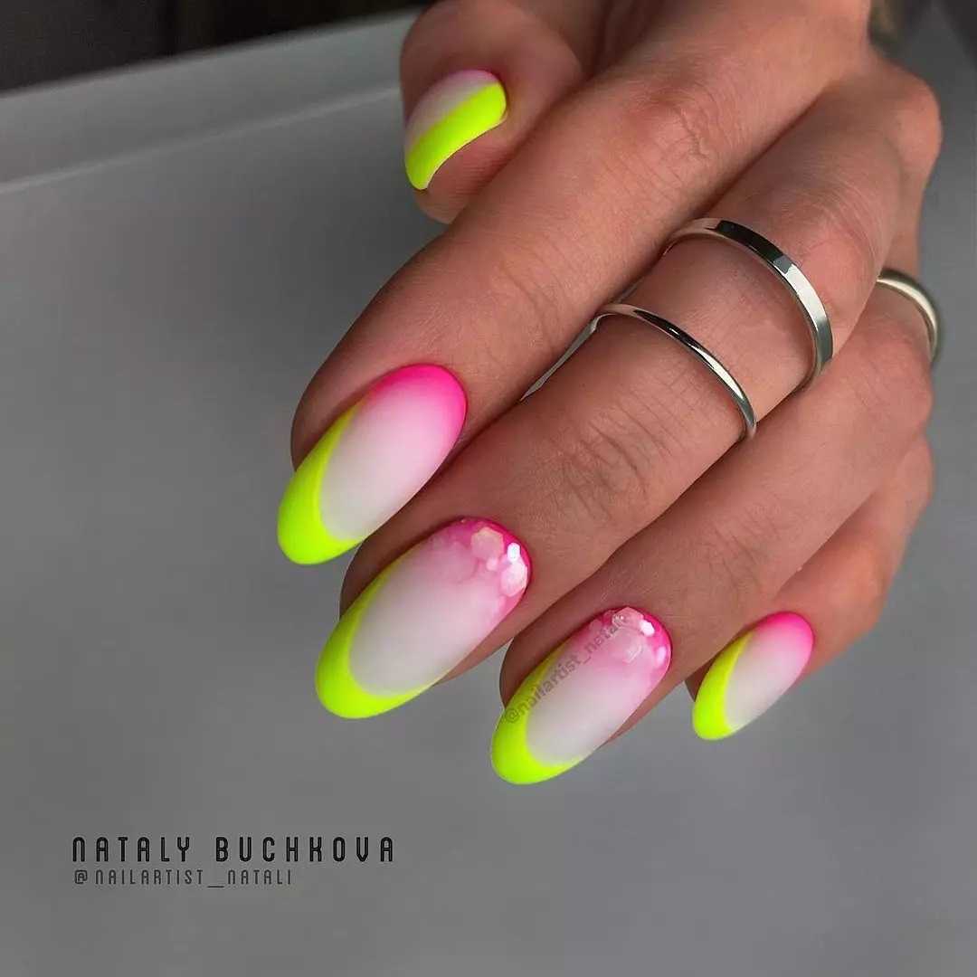 Обычный французский маникюр может легко уживаться с лунным маникюром (также известным как “перевернутый французский”), при котором вы подчеркиваете не кончики, а впадины ногтей. Более того, это одна из самых популярных комбинаций маникюра в 2021-2022 гг. Вы можете покрыть кончики и низ одним и тем же лаком, придумать оригинальные цветовые сочетания или дать волю фантазии, нанося разные оттенки в хаотичном порядке. В любом случае, получится оригинально и модно, как на примерах фотографий из нашей галереи.