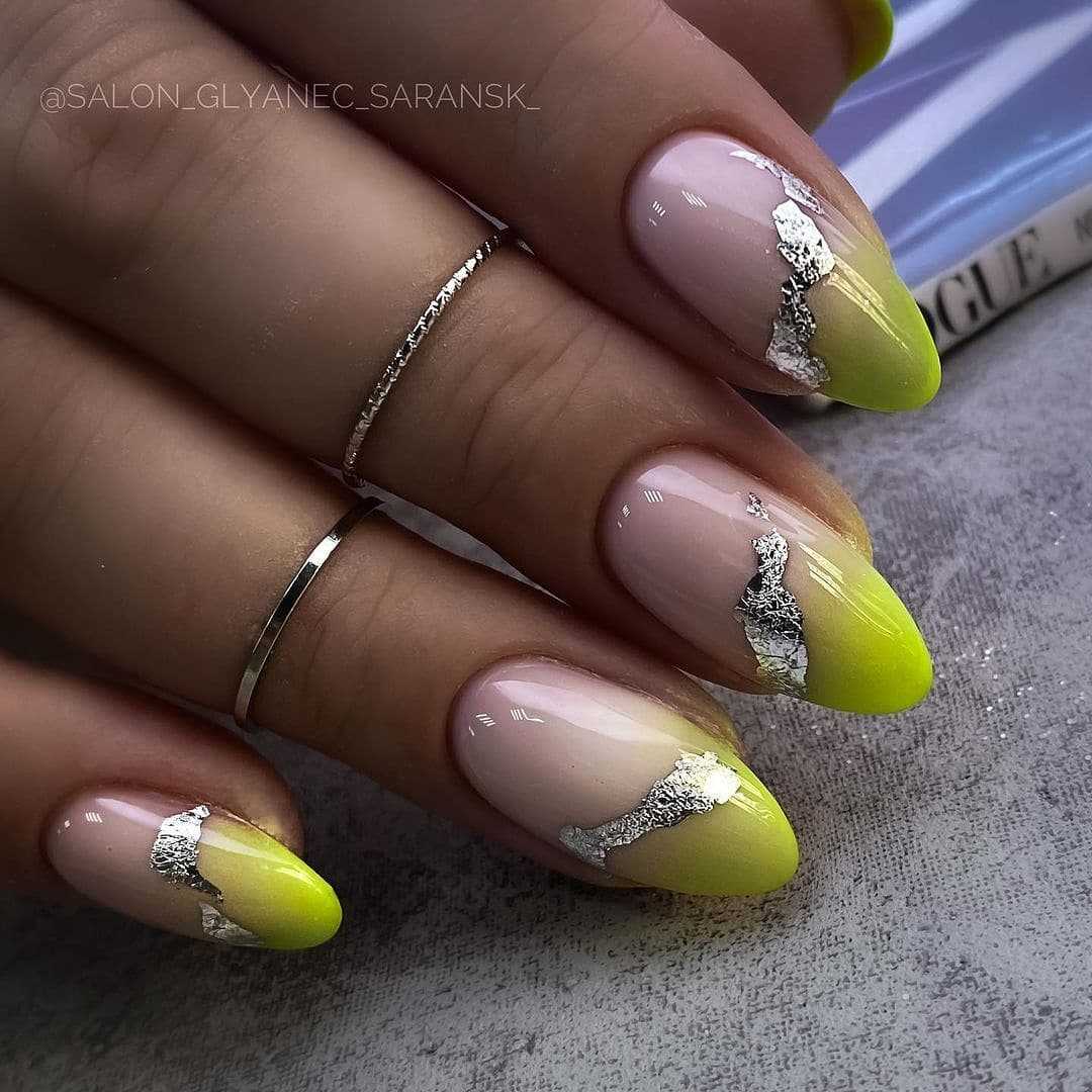 Все чаще для оформления треугольного маникюра используется разнообразный фольгированный декор. Это может быть скотч-лента, камифубуки, «битое стекло» и многое другое. Каждый из предложенных вариантов создает совершенно разный эффект. Поэтому прежде, чем отправиться к мастеру, рекомендуем тщательно продумать свой образ и определиться с оформлением.