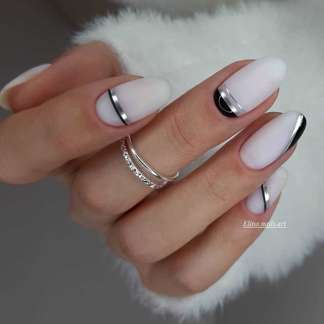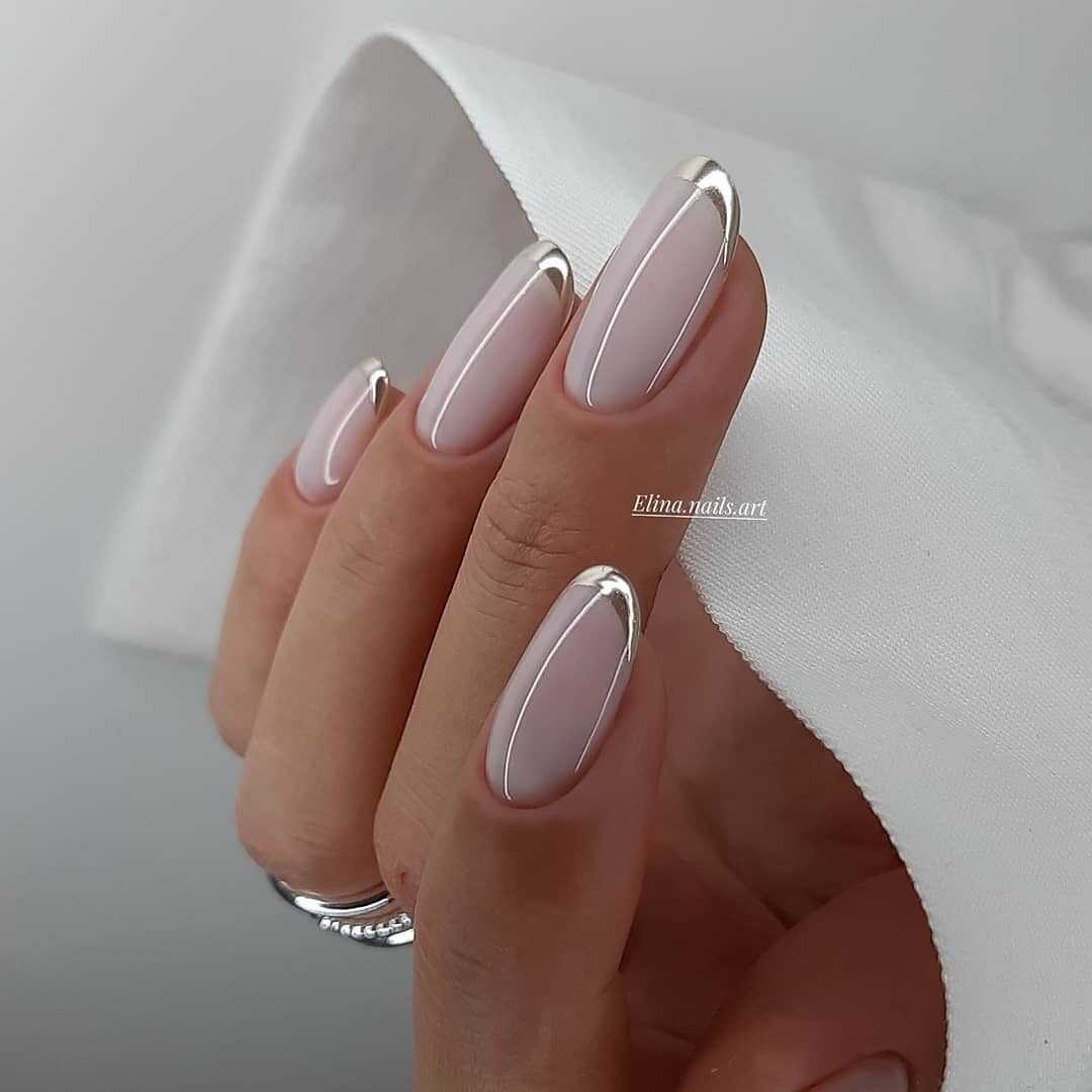 Металлический дизайн всегда выглядит эффектно. Можно выделить серебряным оттенком кончик ногтя, а ногтевую пластину покрасить в нейтральный прозрачный или белый цвет. Не бойтесь экспериментировать с формой “улыбки” и нарисовать ее, например, не полумесяцем, а волной.