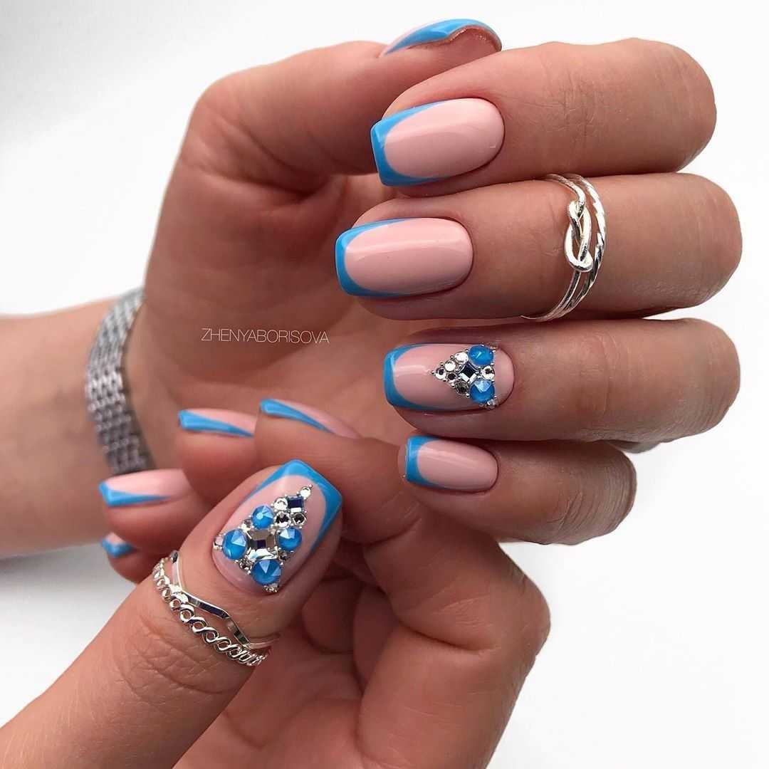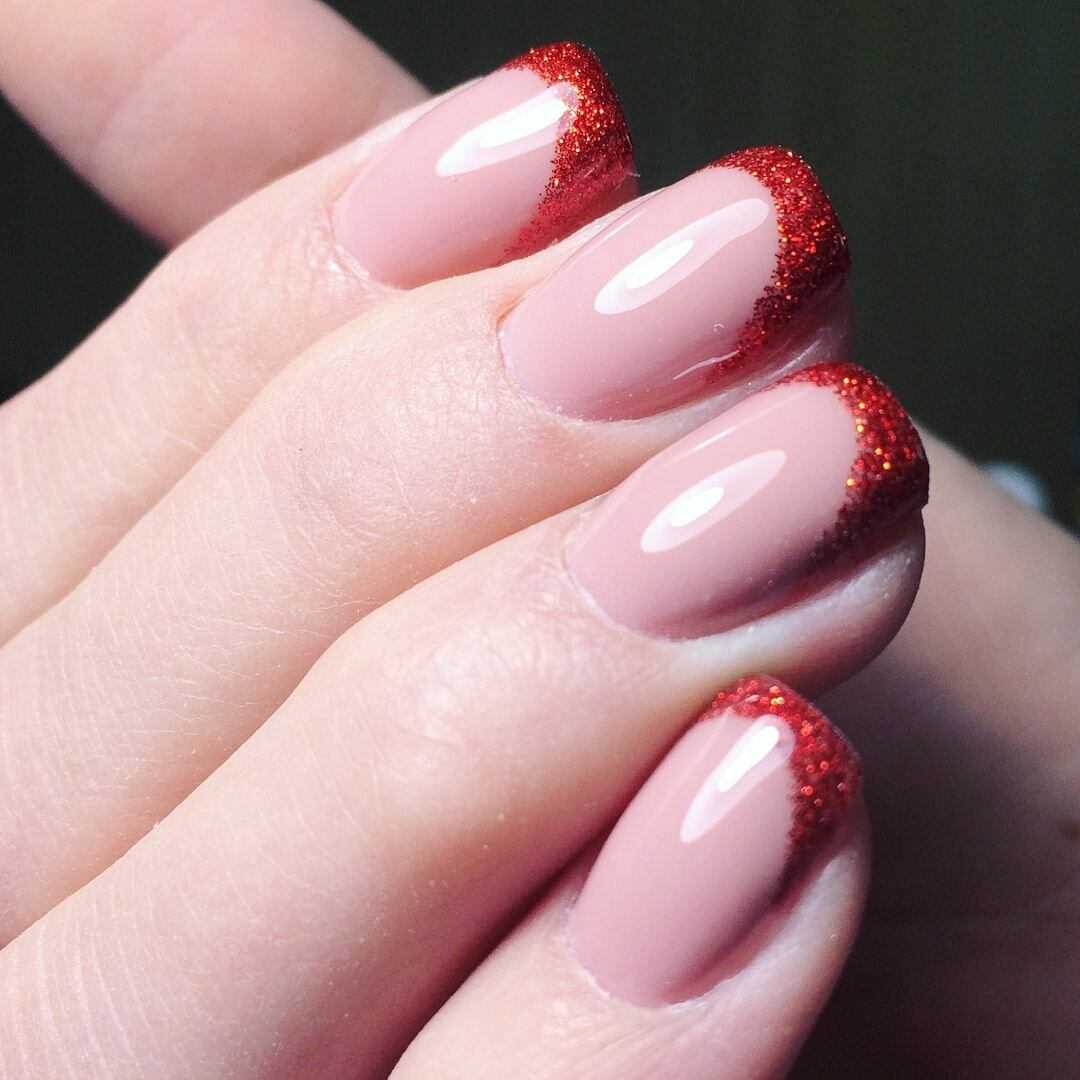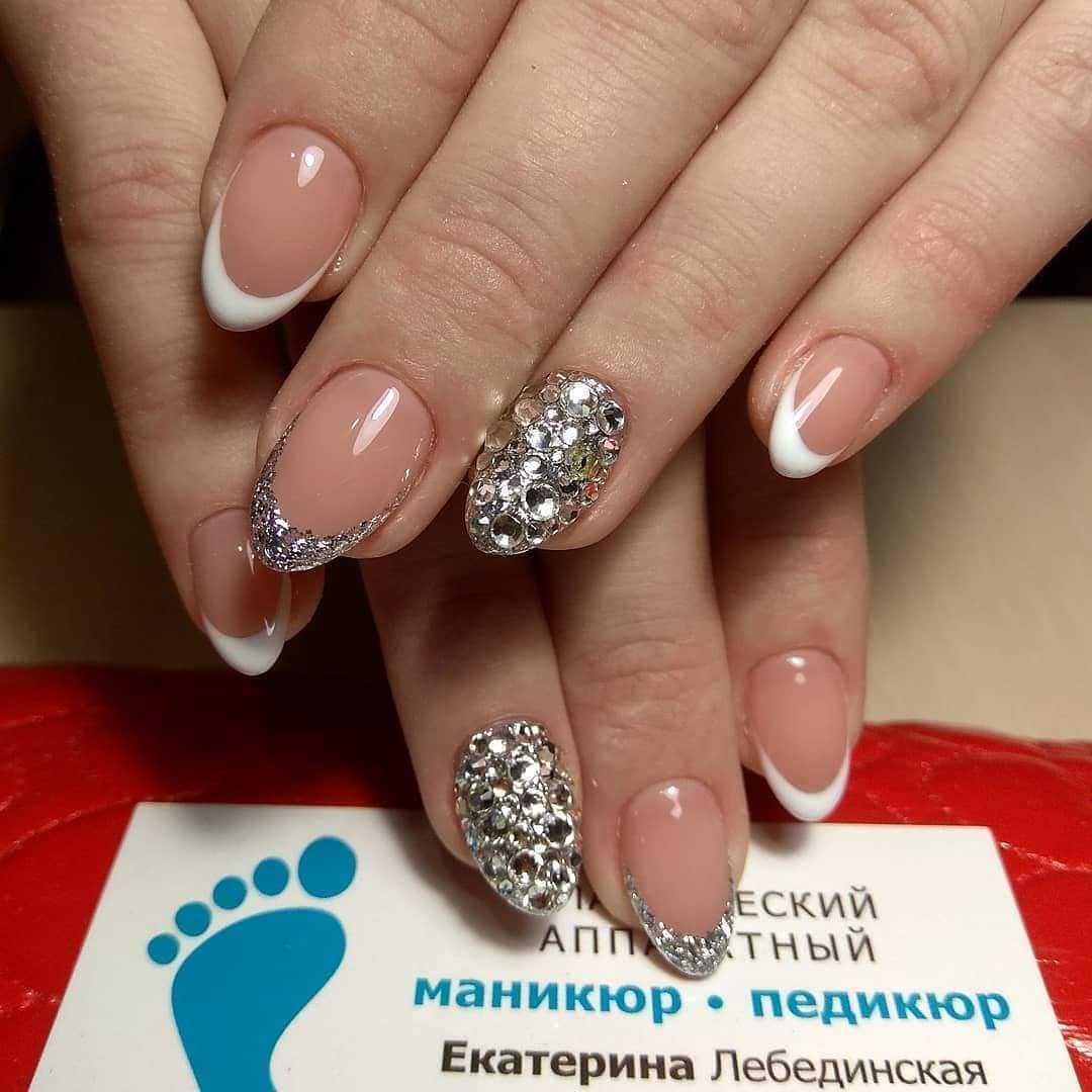 скошенный край в нюдовых оттенках: бежевый, молочный, бледно-розовый и т.д. Чтобы отделить окрашенный кончик от основной площади ногтя, обычно делают диагональ из гель-лака другого цвета или из блесток. Главное не выбирать для «границы» слишком яркие цвета — может пропасть эффект нюда.