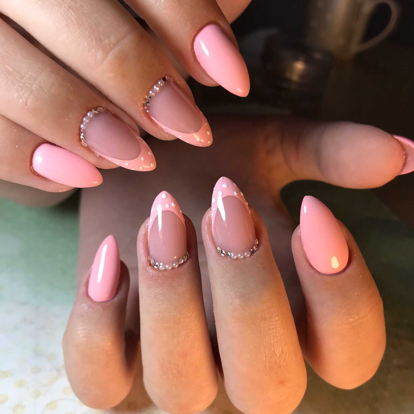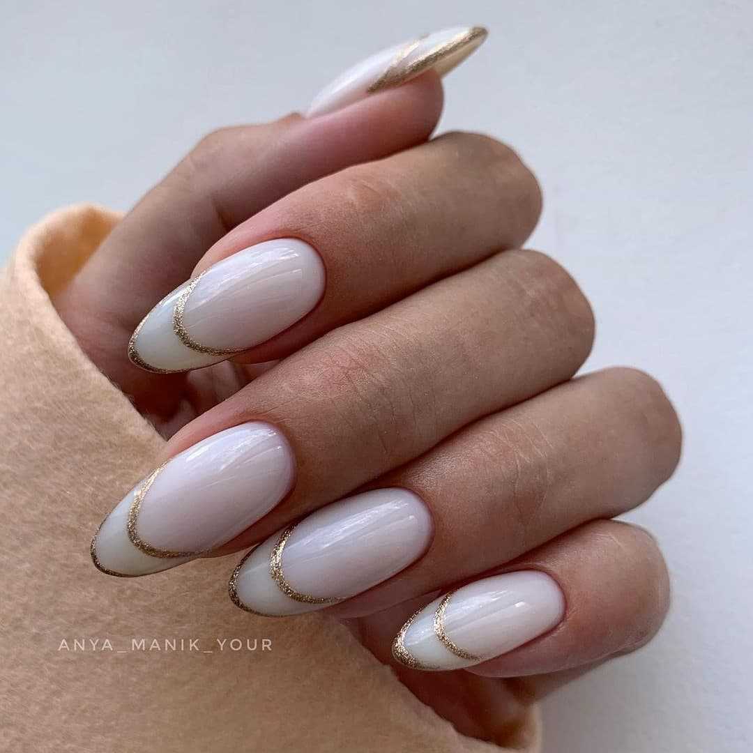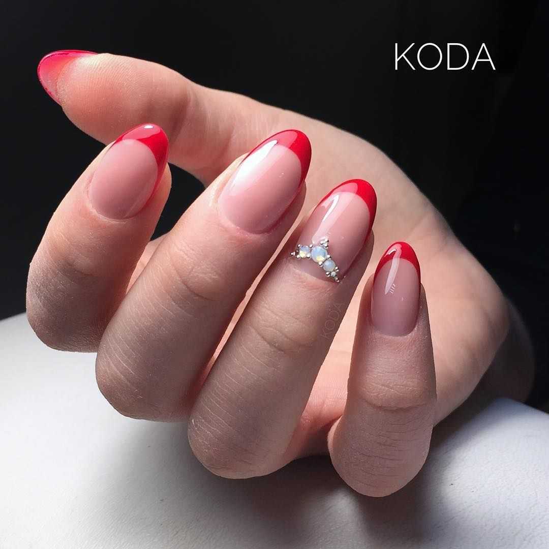 скошенный край в нюдовых оттенках: бежевый, молочный, бледно-розовый и т.д. Чтобы отделить окрашенный кончик от основной площади ногтя, обычно делают диагональ из гель-лака другого цвета или из блесток. Главное не выбирать для «границы» слишком яркие цвета — может пропасть эффект нюда.