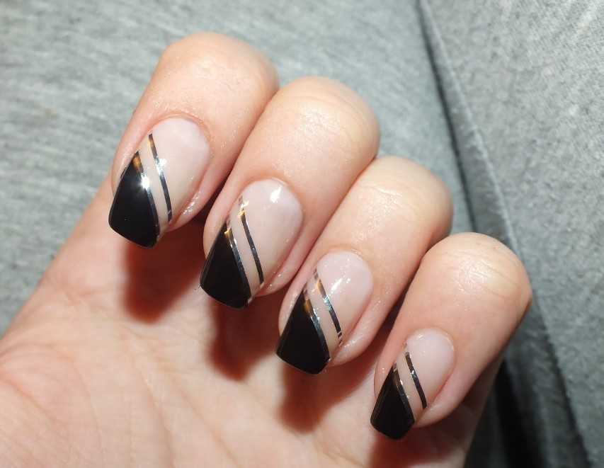 Для создания маникюра с треугольниками также пригодятся фольгированные полосы. С помощью них можно разделять пространство ногтя и выполнять не только треугольный, но и абстрактный декор. Фольгированные полосы можно не убирать после создания треугольного узора, а сделать их частью общего дизайна.