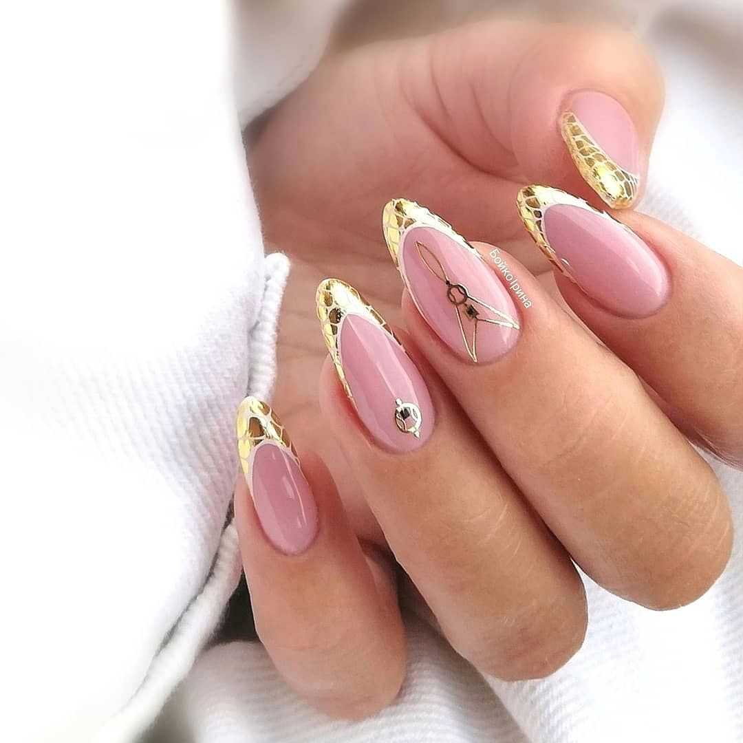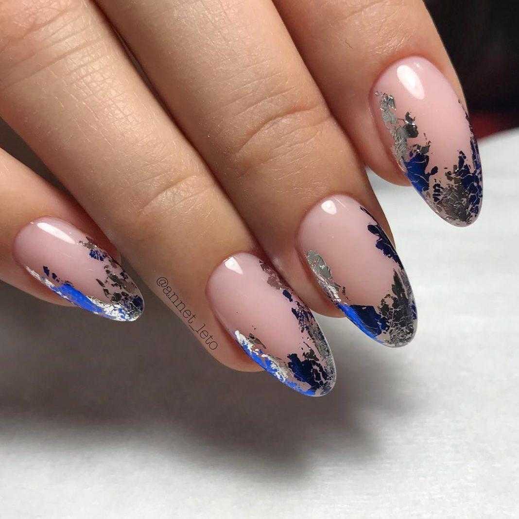 Очень красивый арт френч на ногтях напоминает хлопья патали. Здесь край ногтя кажется украшенным тонкой золотистой фольгой, что выглядит очень необычно и стильно. Такой маникюр идеален для вечерних выходов.