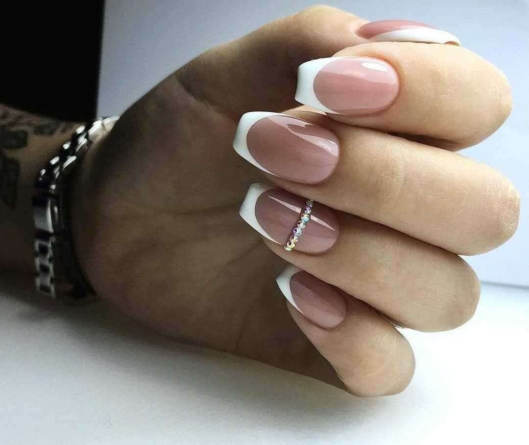- французский маникюр — неширокая белая полоска по краю ногтя;