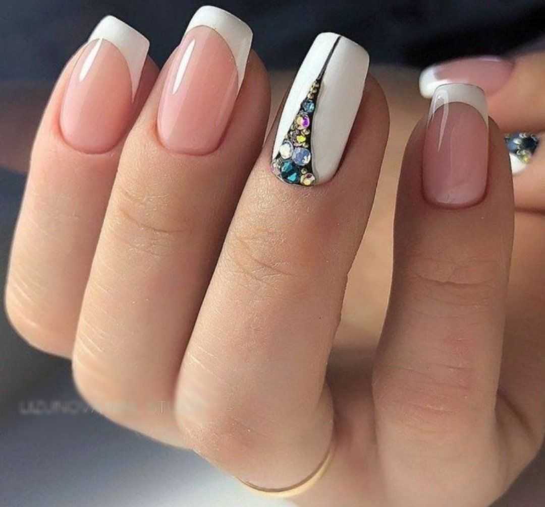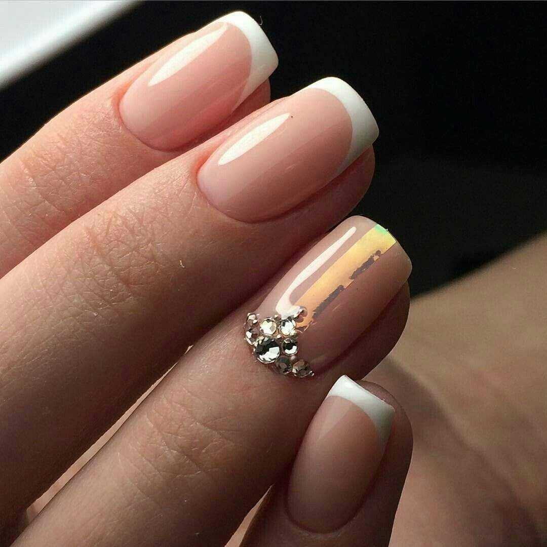 - Если вы делаете простой френч, то лучше использовать мелкие камни либо в верхней, либо в нижней части ногтя.
