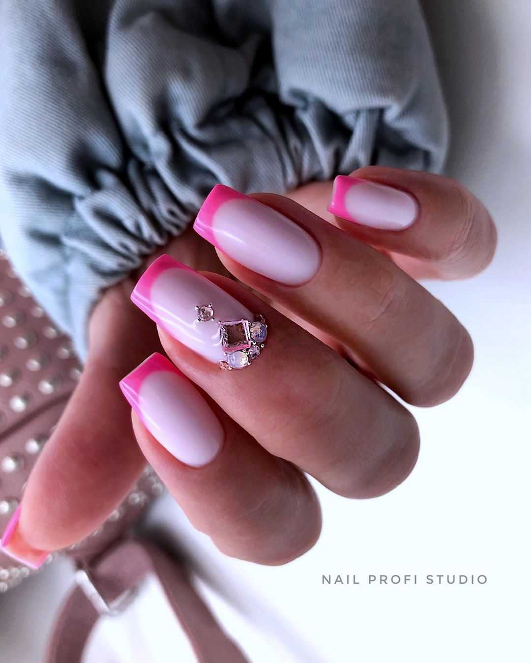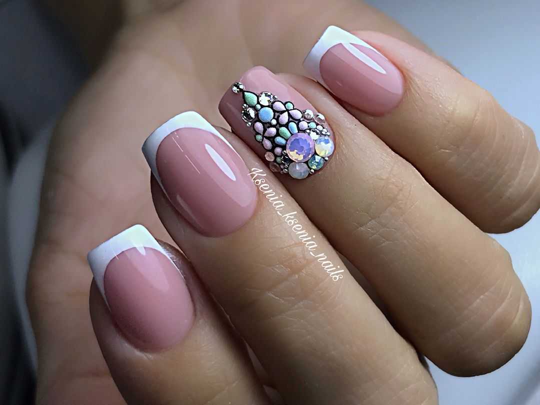 В создании французского дизайна на коготках большой длины важно не переусердствовать – длинные ногти как большой холст, так и манят к себе стразы, глиттеры и камни. Без них маникюр был бы скучным, но и большое количество не добавит рукам нежности, поэтому учтите правило: