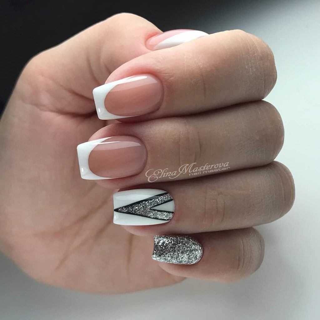 - сочетание френча и геометрии — дизайн может быть исполнен в нескольких вариантах (геометрические узоры на 1-2 ногтях, френч и геометрия на 2-4 ногтевых пластинах и пр.);