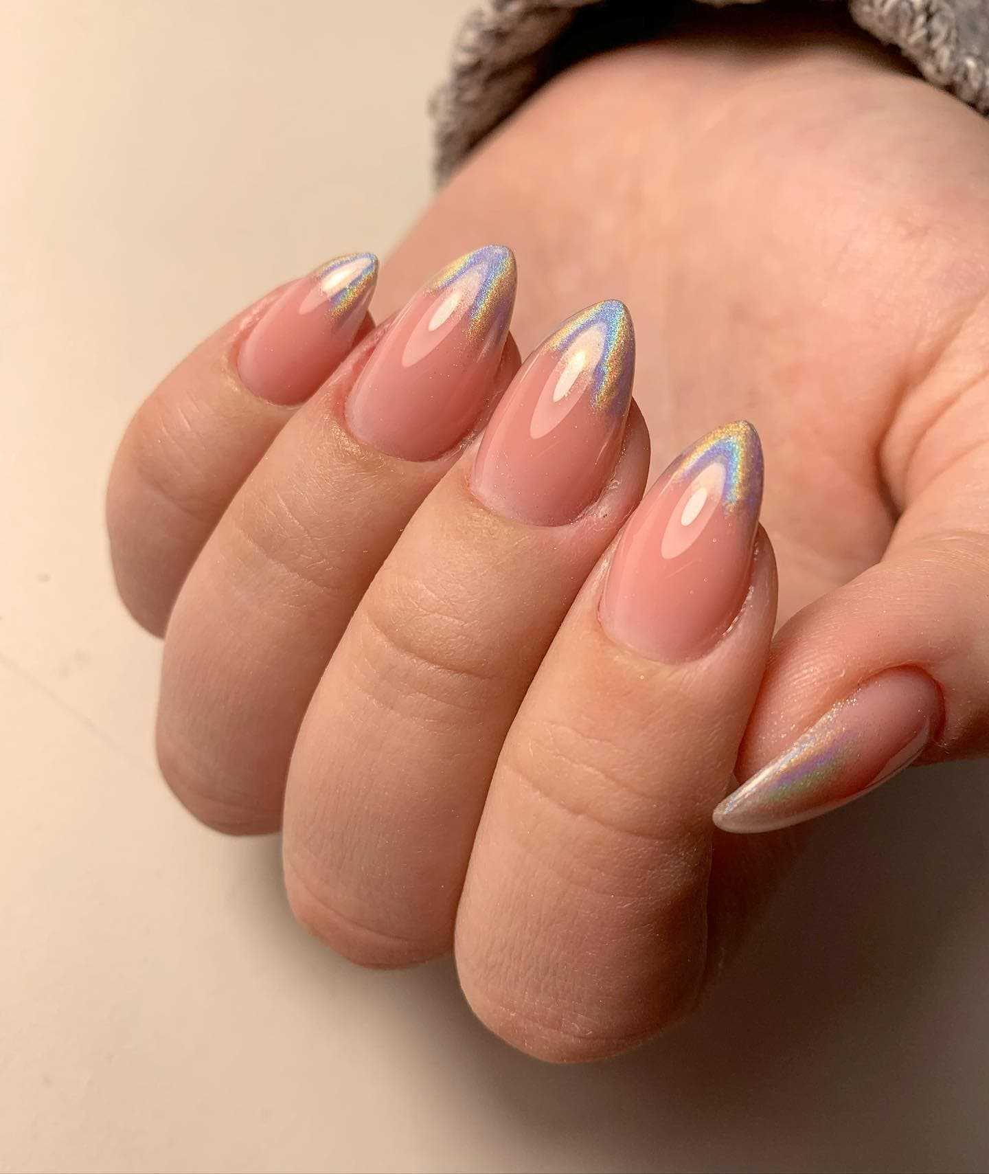 Французский маникюр омбре предполагает градиентное окрашивание одним или несколькими оттенками лака. Такой принт выглядит слегка размытым, его лучше всего сочетать с наращиванием ногтей. Если интересует стильный френч на острые ногти 2023, то омбре в модном оттенке точно подойдет.