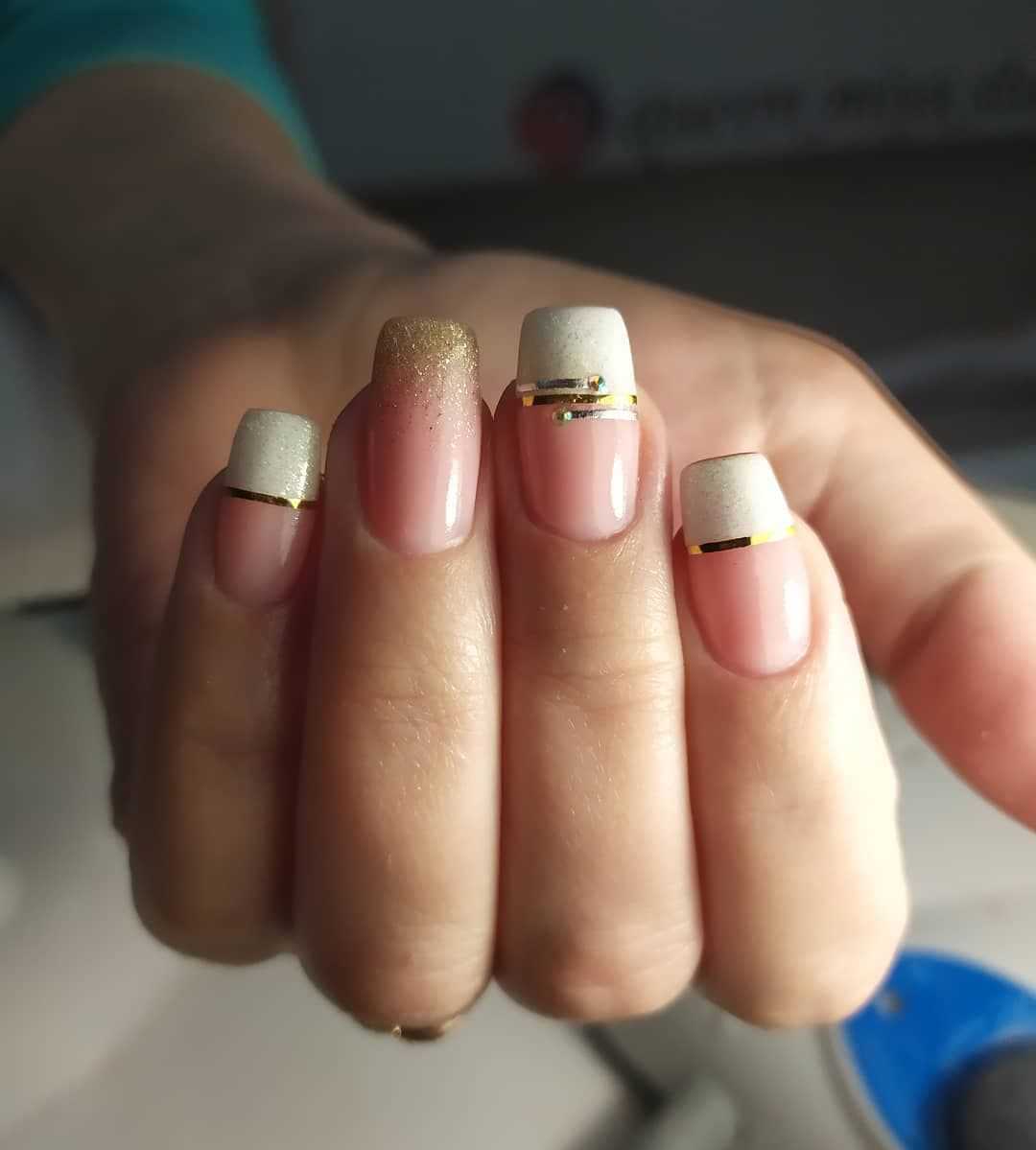 - Нестандартное решение — френч с «улыбкой» разных оттенков на каждом пальце, дублируется на обе руки.