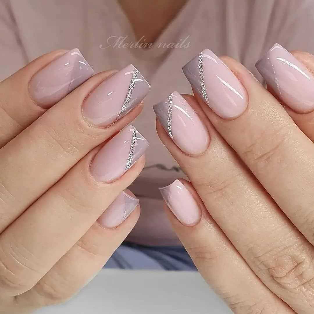 - Визуально удлиняют оттенки бежевого, загорелого и свежего розового. Контрастные «улыбки» придают ногтям более изысканный вид.