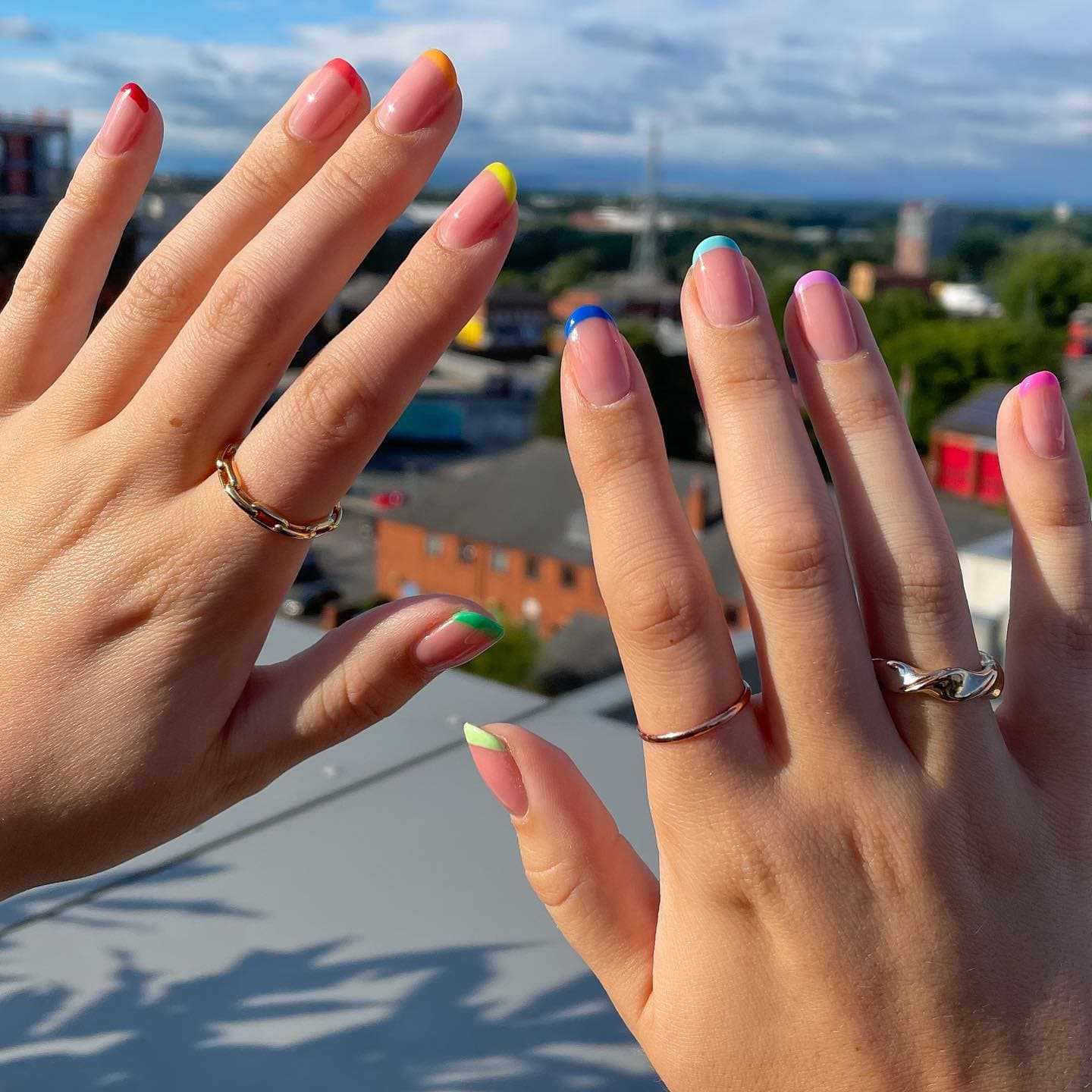 - Радужный френч — окантовка из вертикально либо горизонтально расположенных разноцветных линий.