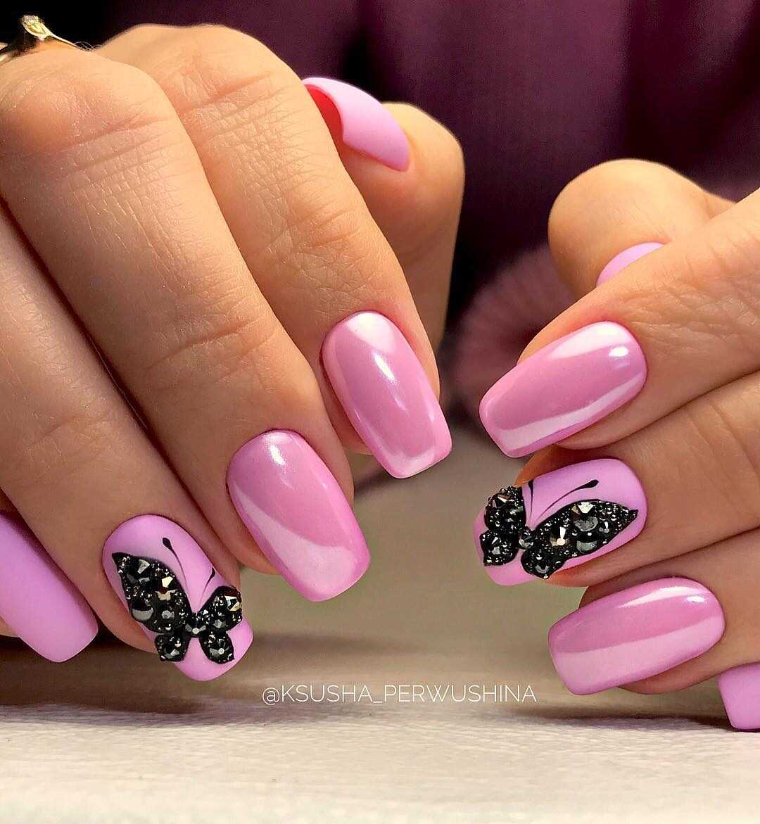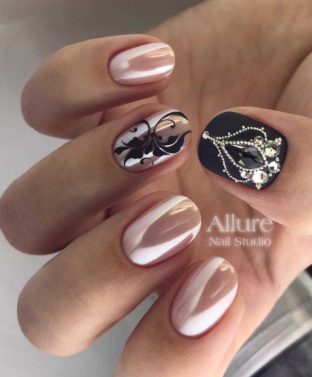 Такой вариант дизайна с применением страз и рисунков отлично дополнит эффектный вечерний образ. Стоит учитывать, что черный перламутровый маникюр можно наносить только на идеально ровные средние или длинные ногти квадратной/заостренной форме. Так получится добиться элегантного и непревзойденного эффекта. Если вам хочется более изысканный дизайн, то стоит рассмотреть сочетание черного с серебром.