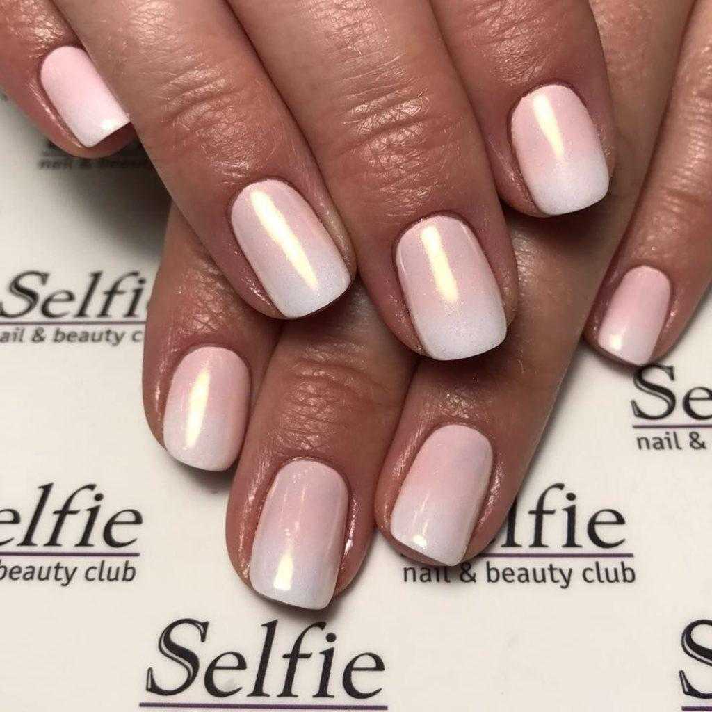 Жемчужная втирка отлично будет смотреться на разной длине ногтя и такой вариант будет особенно модным в 2023 году.