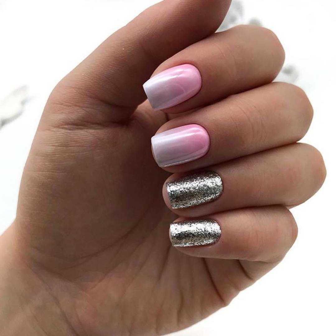 Все эти разновидности блесток великолепно сочетаются с розовым оттенком. В тренде серебряные и золотые блестки, растяжка блестками, сплошное покрытие 1-2 ноготков глиттером, дизайн с втиркой и многое другое. Предлагаем подробнее познакомиться с каждым из этих трендов и выбрать для себя наиболее стильный вариант.